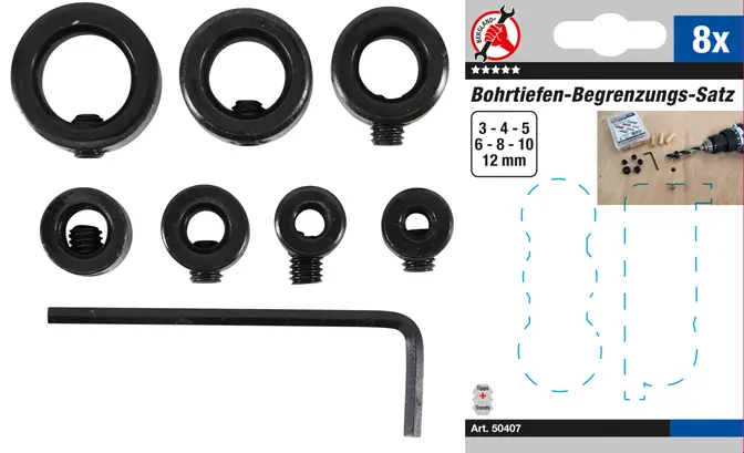 Tato 8dílná sada omezovačů hloubky vrtání je vhodná pro všechny, kdo chtějí vrtat přesné otvory bez rizika, že vrták projede materiálem hlouběji, než je žádoucí. Sada je kompatibilní s běžnými typy vrtáků a představuje praktické řešení pro přesnou práci v dílně i na stavbě.