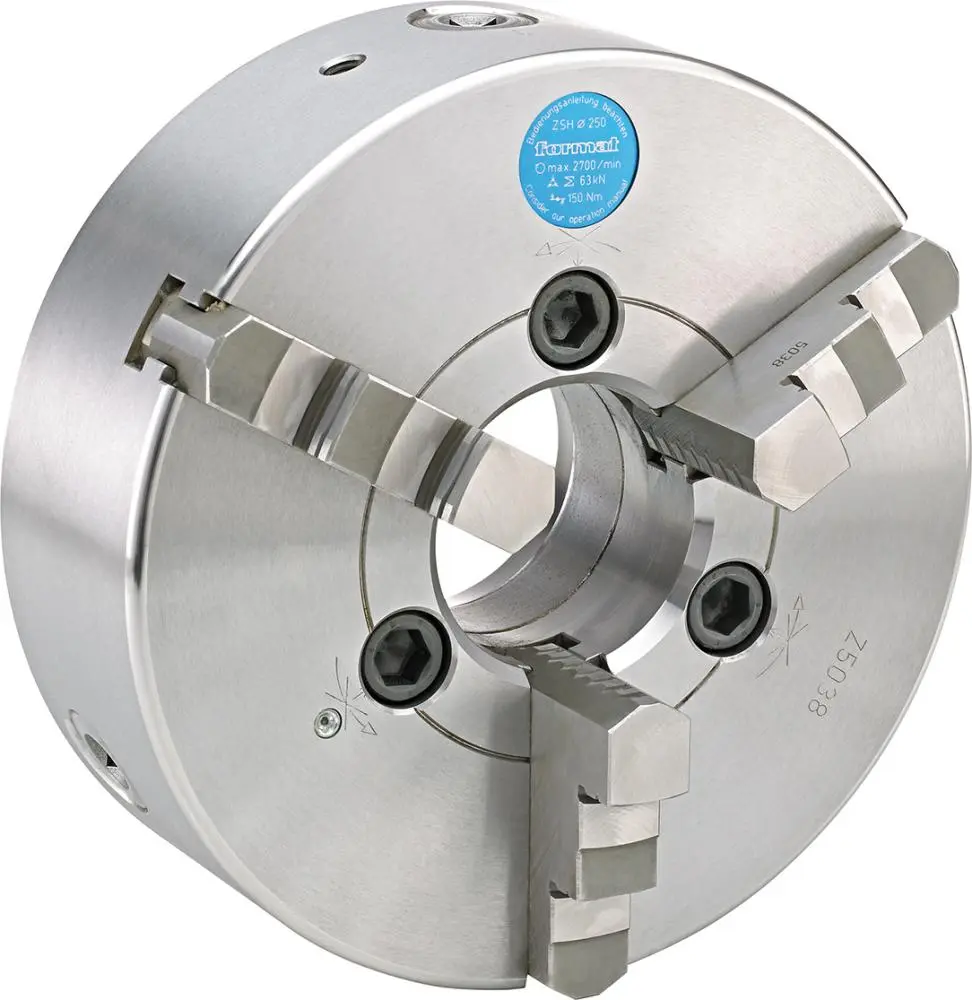 Upínací systém se třemi čelistmi poskytuje rovnoměrné rozložení síly na obrobek, což je důležité pro přesné obrábění. Čelisti jsou navrženy tak, aby umožnily rychlou výměnu a snadné nastavení podle aktuálních potřeb výroby.