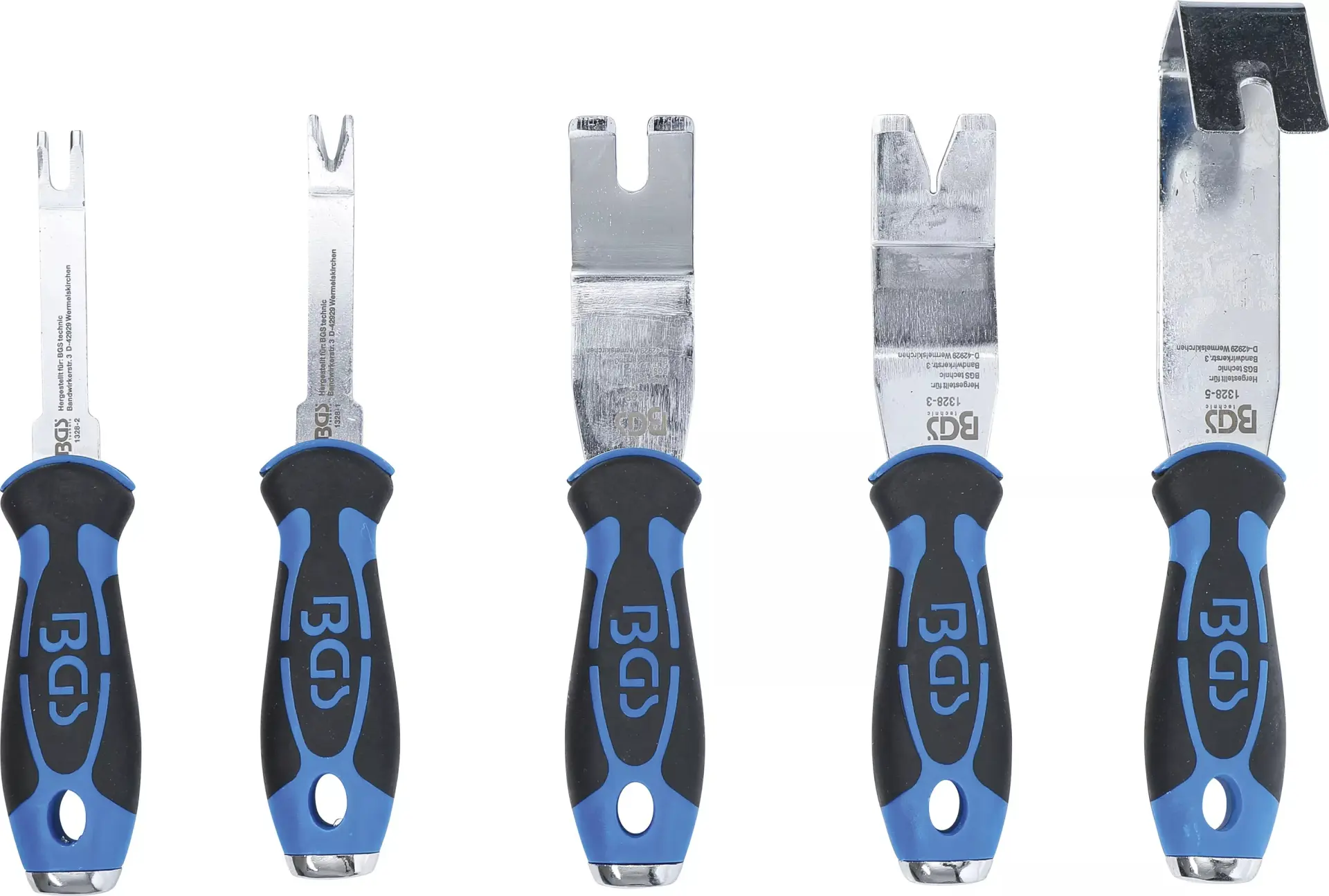 Sada pěti nástrojů BGS101328 usnadňuje demontáž čalounění v interiéru vozidel bez poškození plastových a textilních částí. Ergonomické tvary zajišťují pohodlné držení při práci.