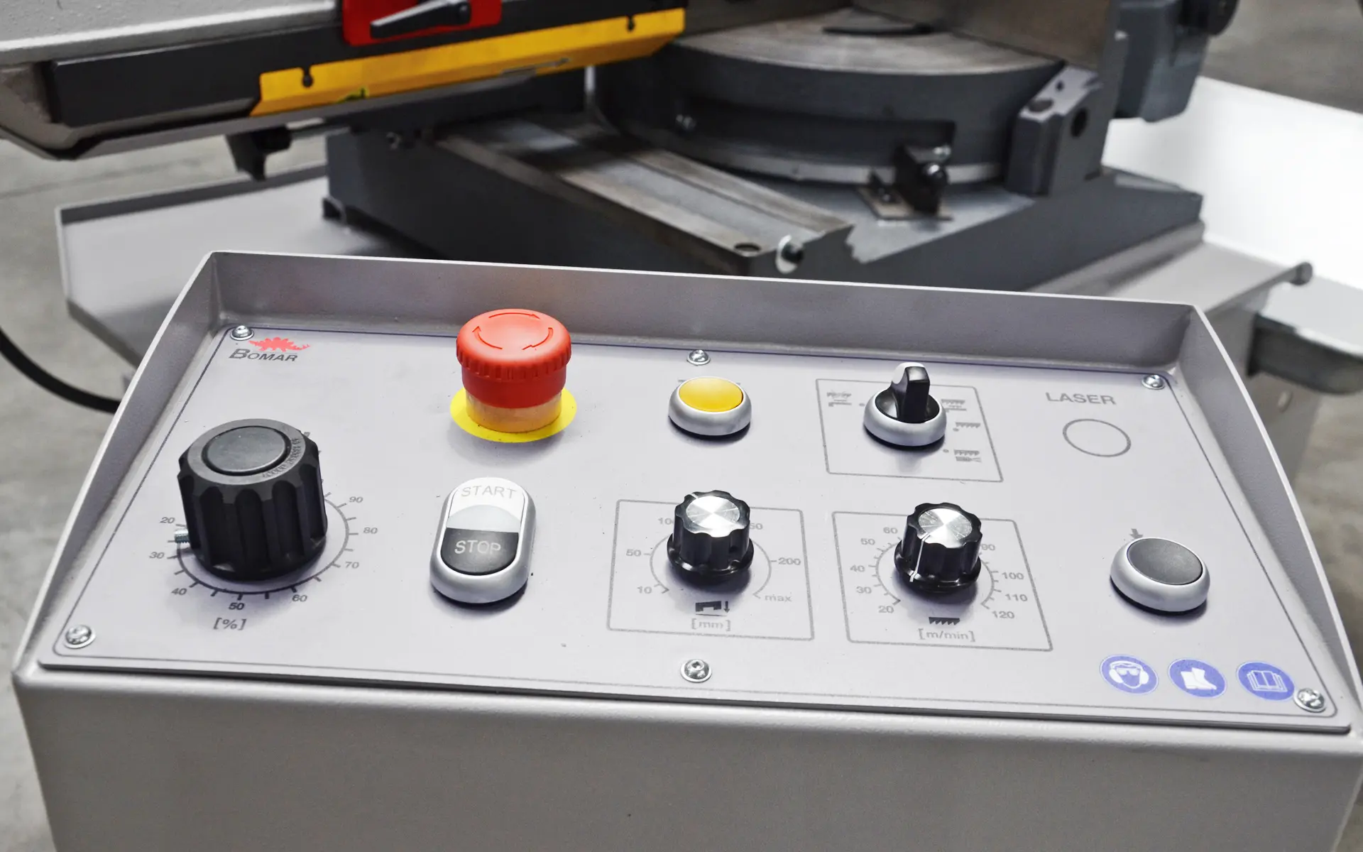 Univerzální poloautomatická gravitační pásová pila Bomar Ergonomic s moderním řídícím systémem v inovovaném provedení s robustním litinovým ramenem a pilovým pásem vysokým 25/27 mm