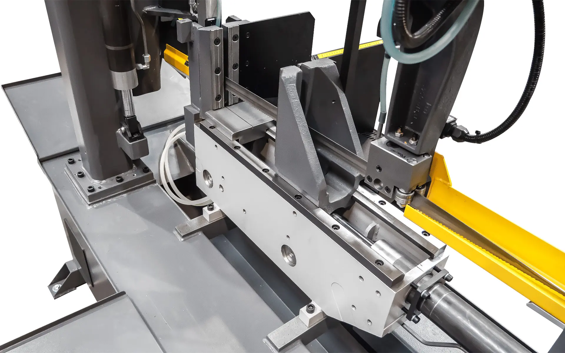 Rameno pily je vedeno dvěma robustními sloupy a je na jedné straně uloženo na předepnutém lineárním vedení bez vůle. Na druhé straně je uloženo na pomocném vedení
