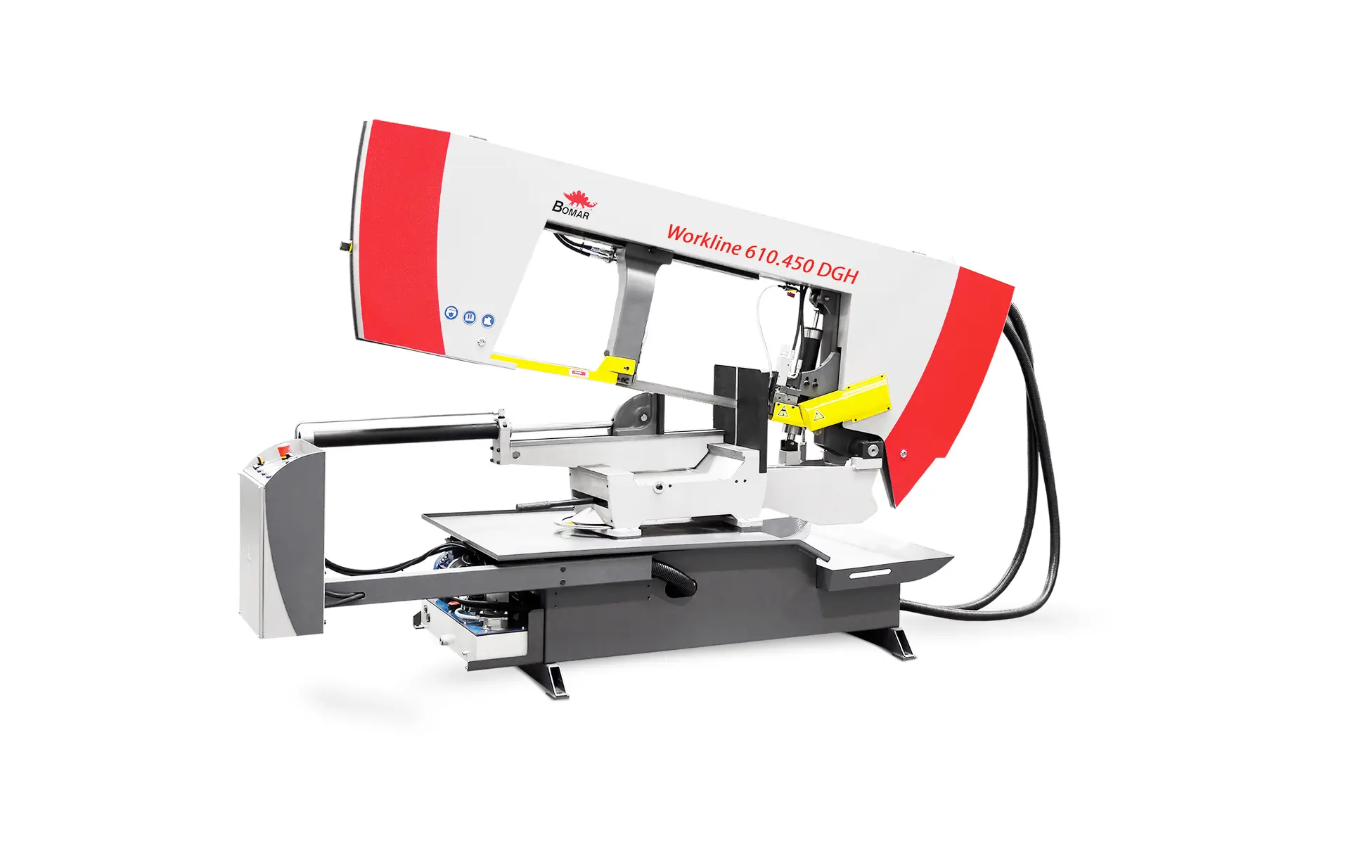 Poloautomatická pásová pila na kov Workline 610.450 DGH umožňuje jednostranné úhlové řezy a dělení materiálu až do průměru 450 mm Standardně se dodává s bezkonkurenčním vybavením a s pomocí inteligentního volitelného vybavení a příslušenství lze stroj přesně přizpůsobit individuálním požadavkům pro kvalitní dělení materiálů.
