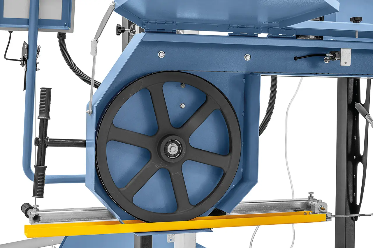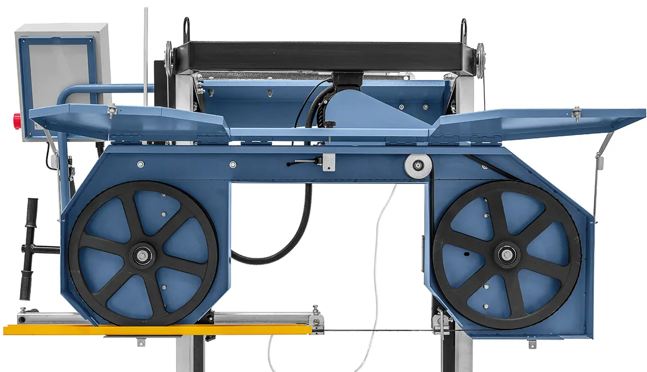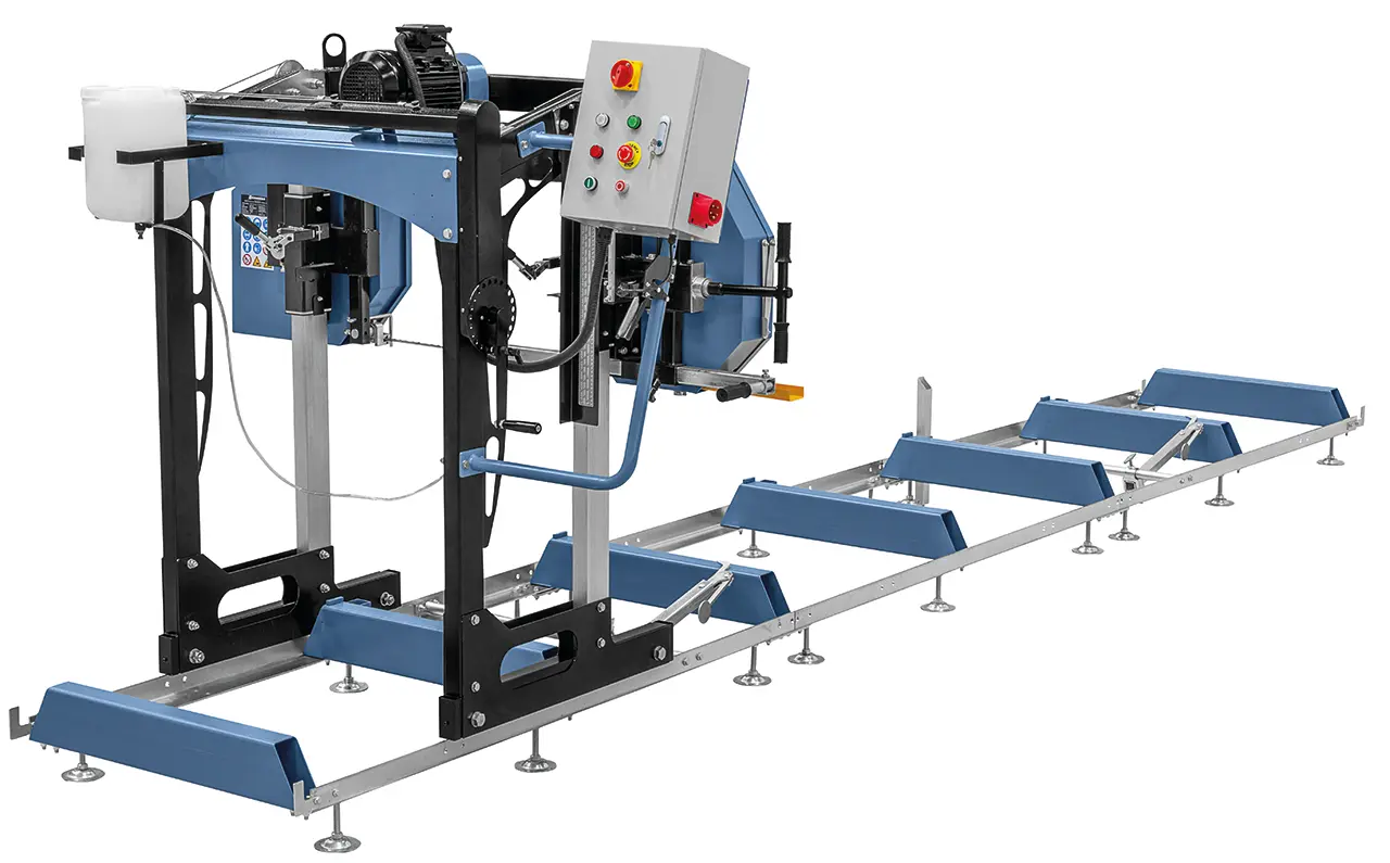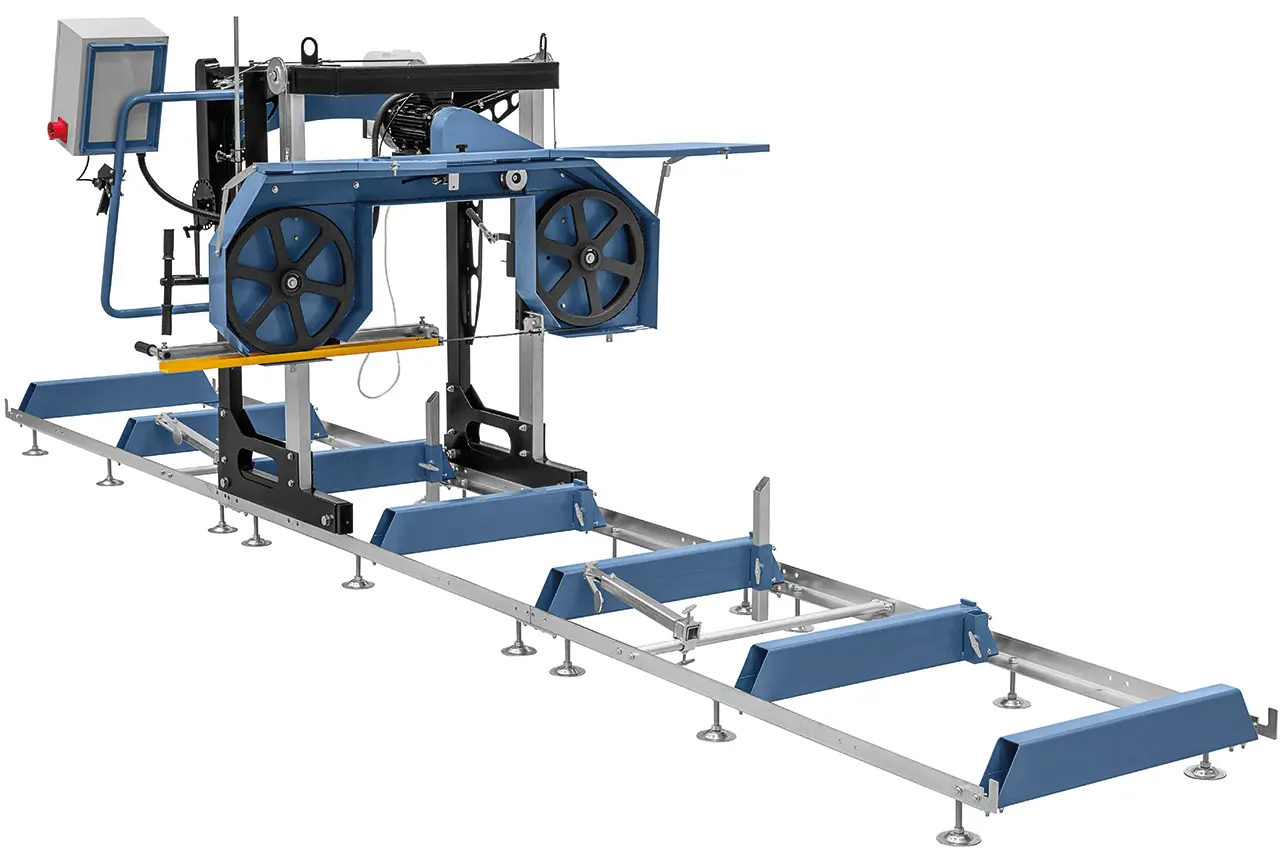 Kmenová pásová pila, motor 5,5 kW, napětí 400 V, průměr kmene 760 mm, délka kmene 5000 mm, pilový pás 3861 x 34 x 1,1 mm, rychlost pilového pásu 18 m.s-1, Rozměry 2200 x 5960 x 1800 mm