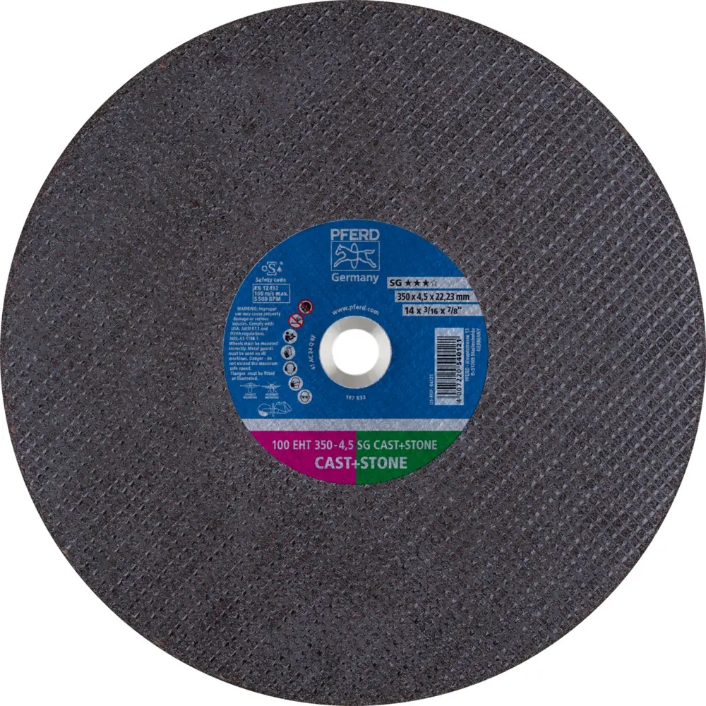100 EHT 350-4,5 AC 24 Q SG Litina / vícevrstvé materiály - Měkké provedení tvrdosti Q. 41 AC 24 Q BF 100. Řezací kotouč pro řezání armovaného plného materiálu (např. armované betonové konstrukční díly, odstředivě lité trubky s betonovým pláštěm).