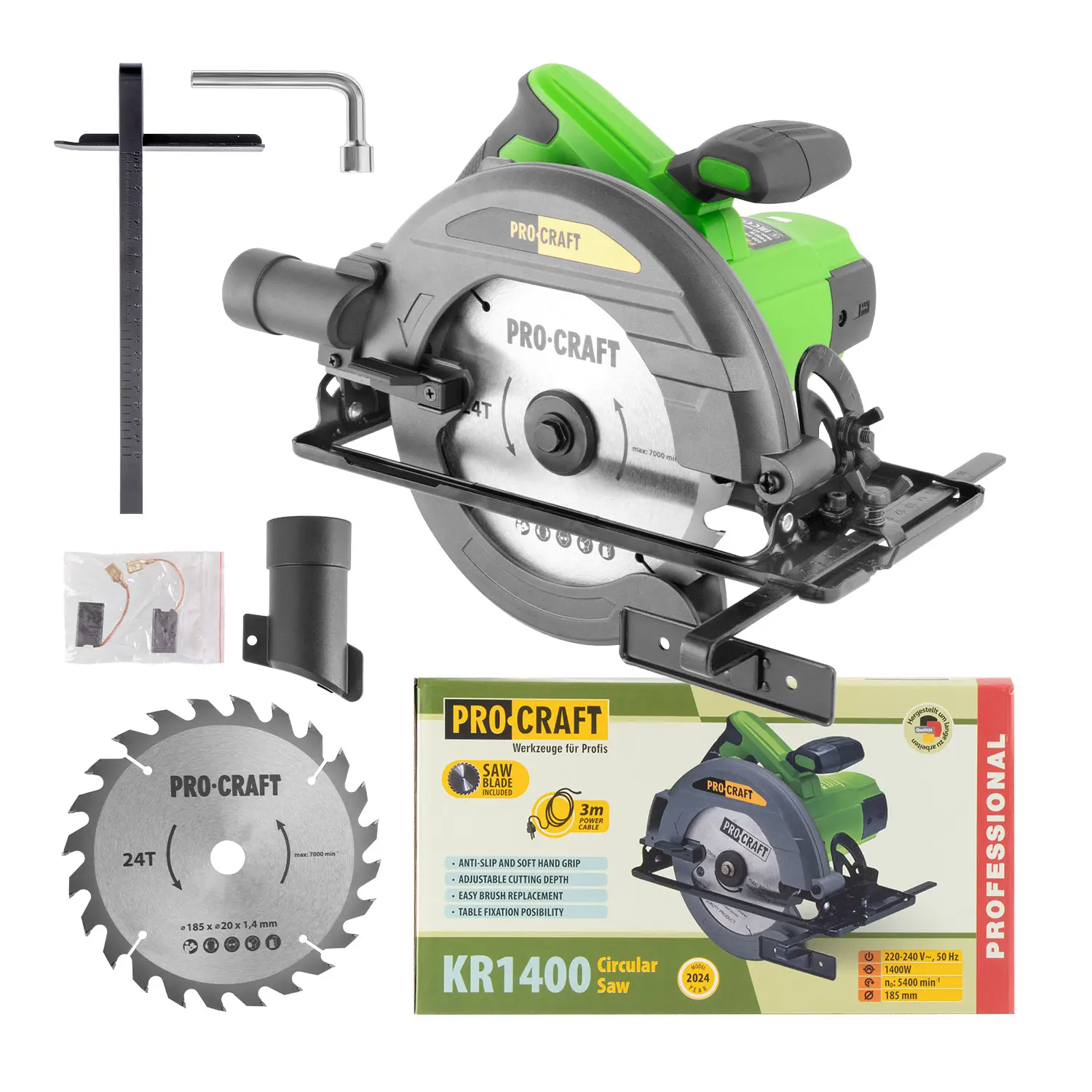 Kotoučová pila Procraft KR1400 je určena k řezání měkkého i tvrdého dřeva a jiných konstrukčních materiálů. Silný motor s výkonem 1400W a vývojem otáček až 5000 zaručuje dlouhou bezporuchovou prací. Regulace hloubky a úhlu řezu umožňuje nastavení optimálních parametrů při práci s různými materiály. Možnost připojení vysavače přes hadici zaručí čisté pracovní prostředí. Součástí dodávky jsou inbusový klíč, uhlíkové kartáče, paralelní doraz a pilový kotouč 185mm. Balení karton.
