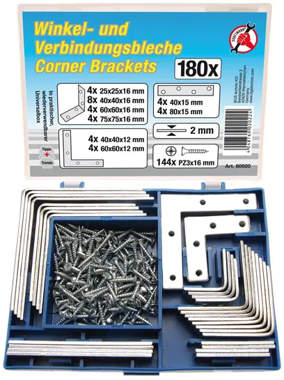 Tato sada rohových konzol obsahuje 180 dílů, které jsou určeny pro spojování a zpevnění různých konstrukcí. Využijete ji při montáži nábytku, stavbě polic, regálů nebo při opravách v domácnosti i dílně. Konzoly jsou vhodné pro dřevo, kov i další materiály, kde je potřeba zajistit stabilní pravý úhel.