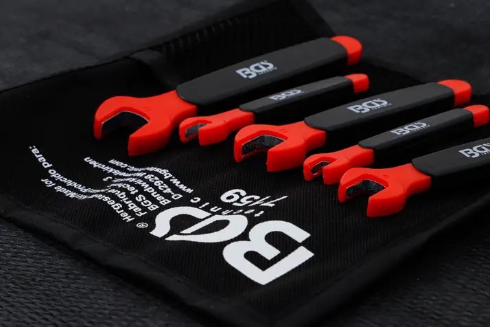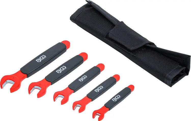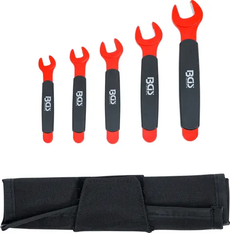 Sada pěti jednostranných plochých klíčů VDE 7–14 mm je určena pro práci pod napětím do 1000 V, splňuje normu EN 60900. Ergonomické rukojeti zajišťují pevný úchop při montážích v elektrotechnice.