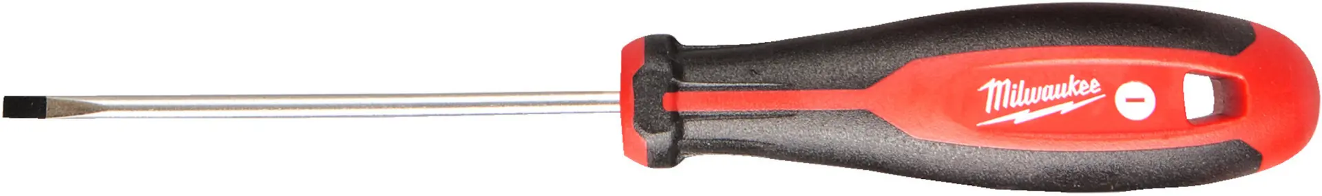 Samostatný plochý šroubovák výrobce Milwaukee, SL (plochý), šíře konce hrotu 0,8 mm, průměr dříku 4 mm, délka šroubováku 100 mm, Tri-lobe ergonomická trojhranná rukojeť, kruhový dřík, tvrzený magnetický hrot pro maximální trvanlivost a přesnější upev