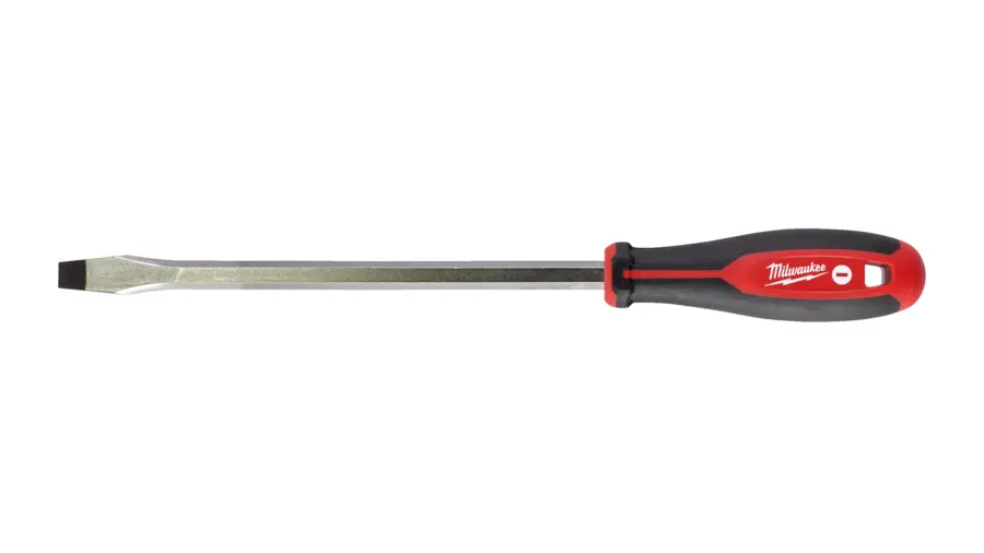 Samostatný plochý šroubovák výrobce Milwaukee, SL (plochý), šíře konce hrotu 1,6 mm, průměr dříku 10 mm, délka šroubováku 200 mm, Tri-lobe ergonomická trojhranná rukojeť, upravený dřík přizpůsobený k dotažení klíčem, tvrzený magnetický hrot pro maxim