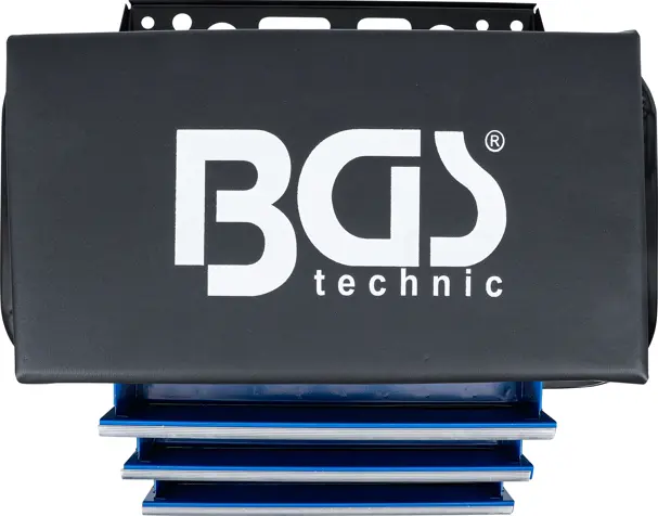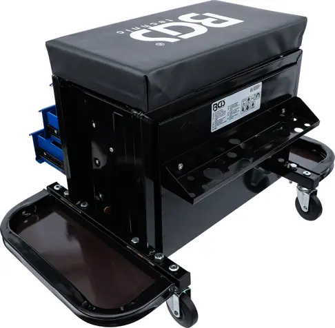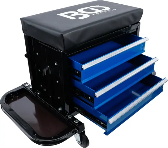 Pojízdné dílenské sedátko BGS102859 nabízí tři zásuvky pro uložení nářadí, otočná kolečka pro snadný přesun a stabilní konstrukci pro práci v dílně.