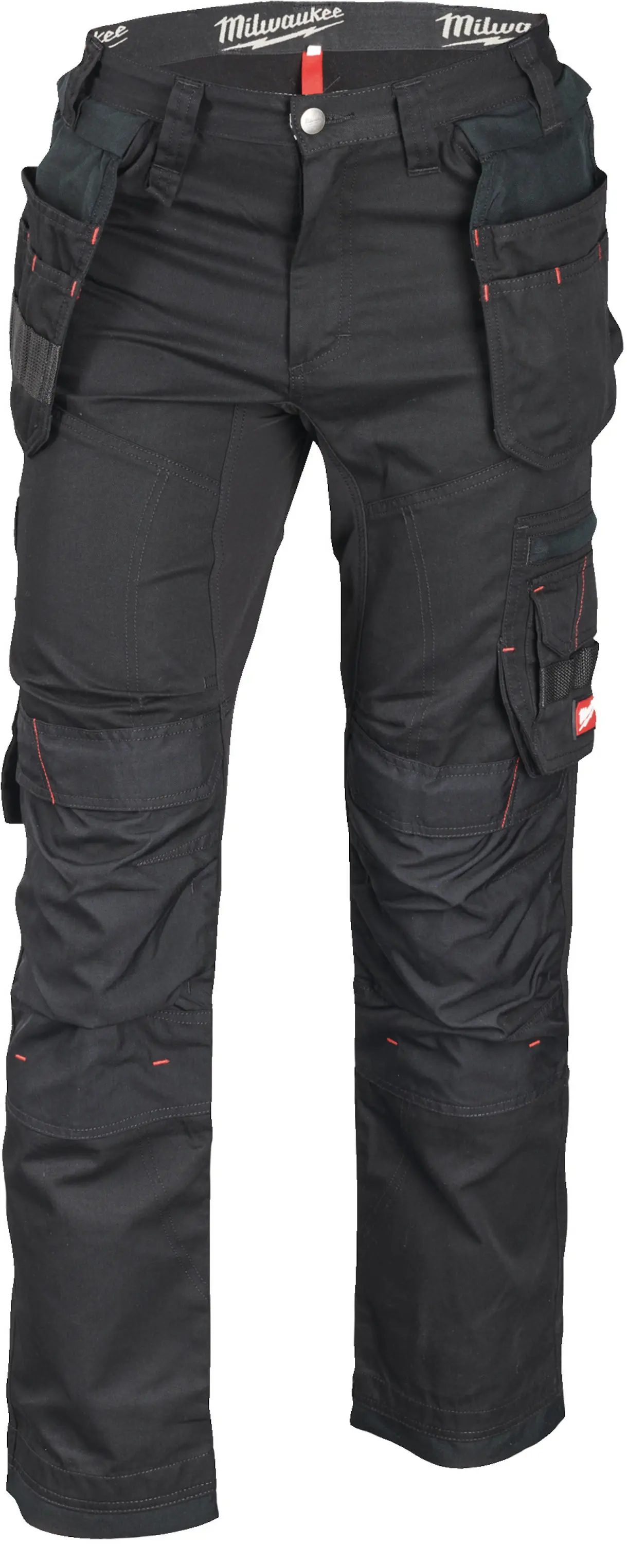 Pohodlné a odolné pracovní kalhoty vel. XL, pro venkovní i vnitřní použití, strečový materiál (65 % recyklovaný polyester / 35 % bavlna), variabilní uložení nářadí v kapsách (uzavíratelné i otevřené) nebo poutkách.