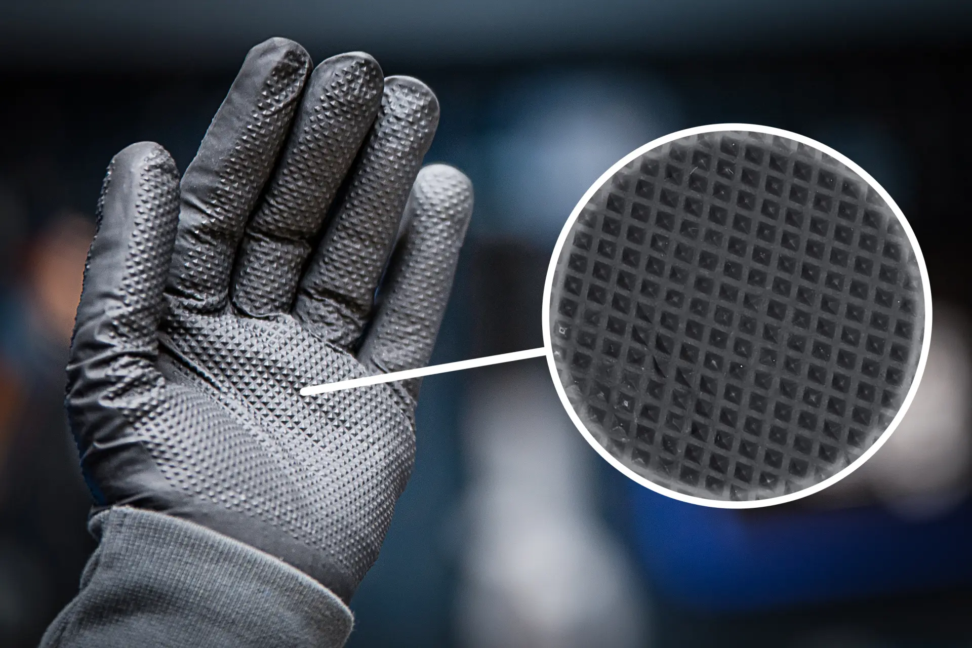 Extra přilnavost těchto rukavic zajišťuje speciální povrchová úprava, která pomáhá udržet pevný úchop i v náročnějších podmínkách. To je praktické například při manipulaci s nástroji, v laboratoři nebo při úklidu.