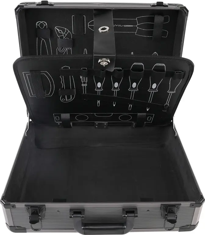 Praktické uzavírání na klipy umožňuje rychlé otevření i zavření kufru, což šetří čas při práci. Kufr je vybaven také pohodlným madlem pro snadné přenášení, ať už v dílně nebo na cestách.