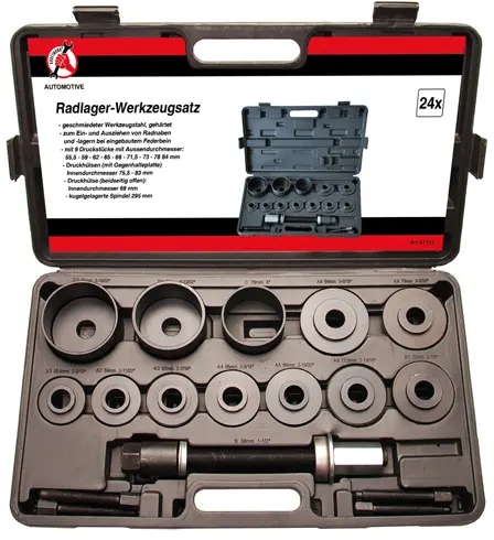 Univerzální 21dílná sada BGS1067310 obsahuje nástroje pro montáž a demontáž ložisek kol, vhodná pro různé typy vozidel a průměry ložisek. Robustní kufřík usnadňuje přenášení i skladování.