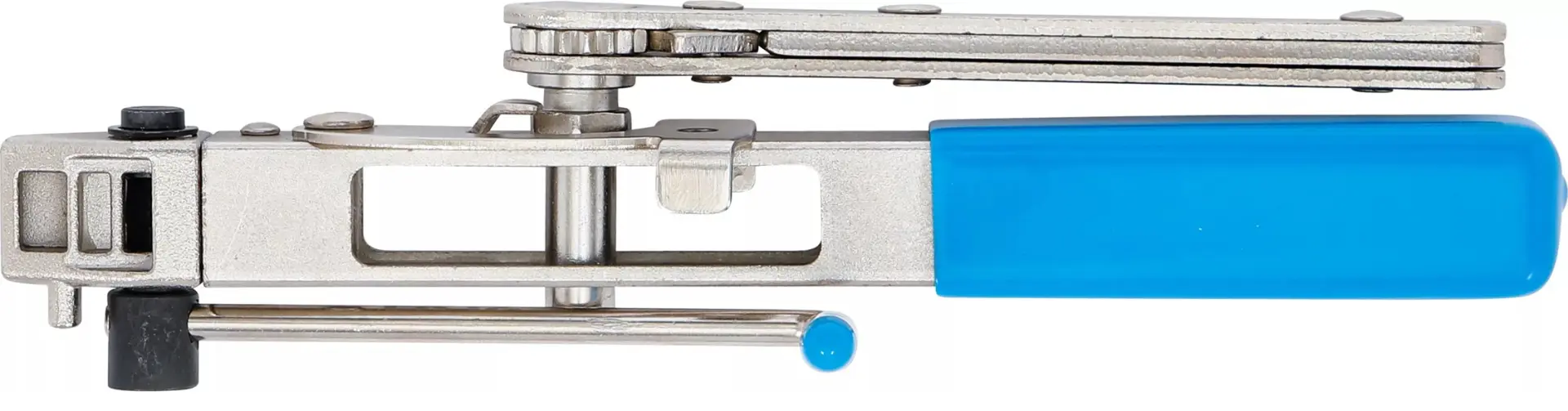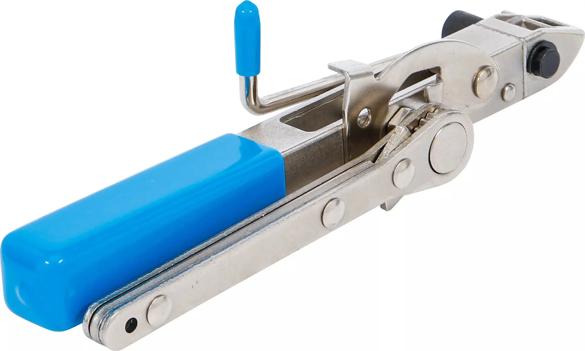 Hlavní část nástroje tvoří robustní tělo z odolného materiálu, které zajišťuje dlouhou životnost i při častém používání. Ergonomicky tvarovaná rukojeť přispívá k pohodlnému držení a umožňuje přesné ovládání síly při napínání pásu. Díky tomu je možné dosáhnout požadovaného utažení bez zbytečné námahy.