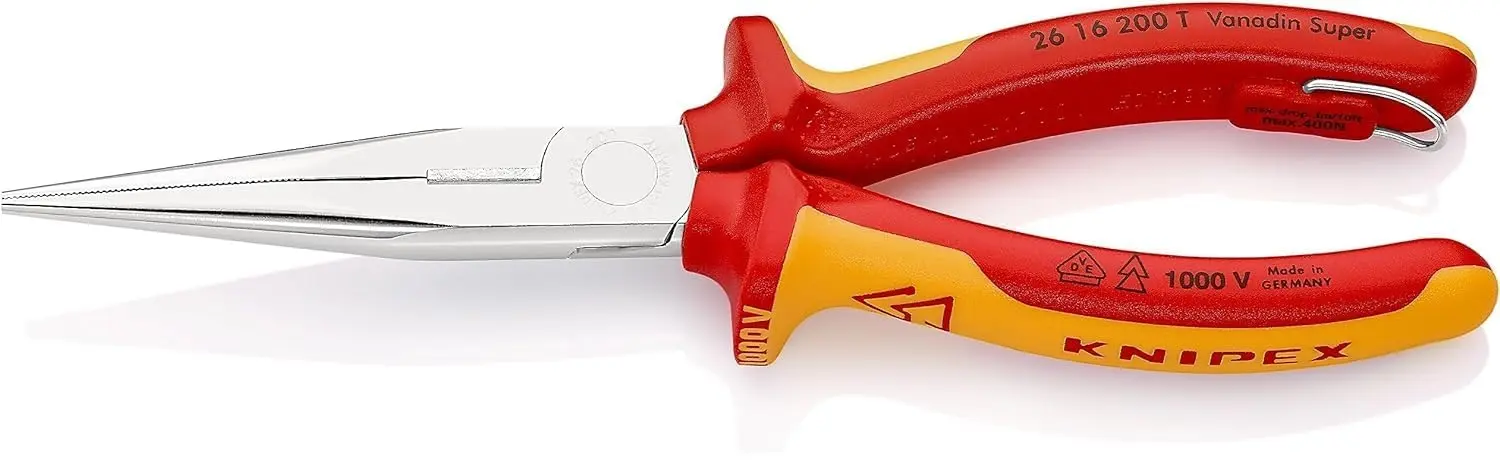 Pochromované dlouhé a úzké ploché kleště, s integrovaným izolovaným připevňovacím okem pro připevnění pojistky proti upadnutí, v provedení s vysoce zatížitelnými, elastickými precizními zašpičatělými hroty. Rukojeti izolované vícesložkovými návleky, certifikace VDE