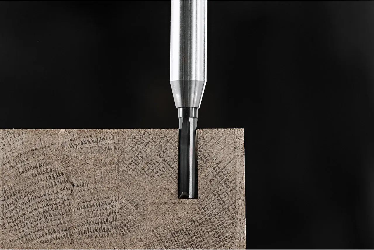Dvě řezné hrany z tvrdokovu zajišťují čisté, hladké a přesné drážky v měkkém i tvrdém dřevě, MDF, laminovaných deskách, překližce, plastech a kompozitech. Frézy o průměru 3–8 mm jsou celokarbidové pro vyšší odolnost a delší životnost