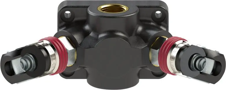 Provedení: Otočná bezpečnostní spojka JS 7,2 pro použití stlačeného vzduchu, do max. 12 bar. Z vysoce pevného plastu zesíleného skelným vláknem. Všechny krabice rozdělovače jsou opatřeny odolnou mosaznou závitovou vložkou pro vysoké utahovací momenty a jsou certifikovány TÜV.