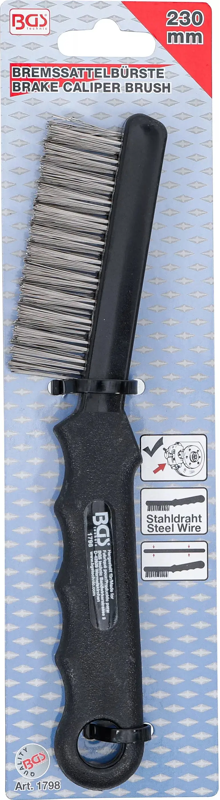 Ruční kartáč 220 mm BGS101798 je určený pro čištění brzdových třmenů, má ergonomickou rukojeť a odolné štětiny pro efektivní odstranění nečistot i rzi.