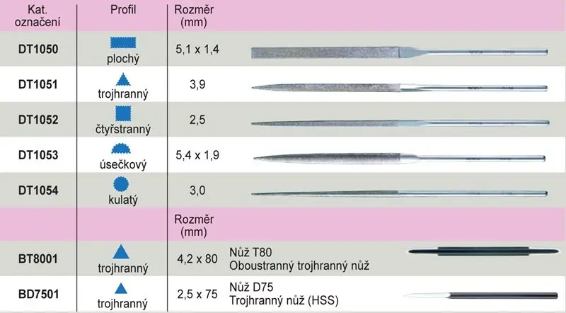 Sada s 5 diamantovými pilníky a 2 trojhrannými noži.Pilníky jsou vyráběny z kvalitních švýcarských polotovarů, na které je elektrolyticky nanesena diamantová vrstva.Celková délka: 140 mm