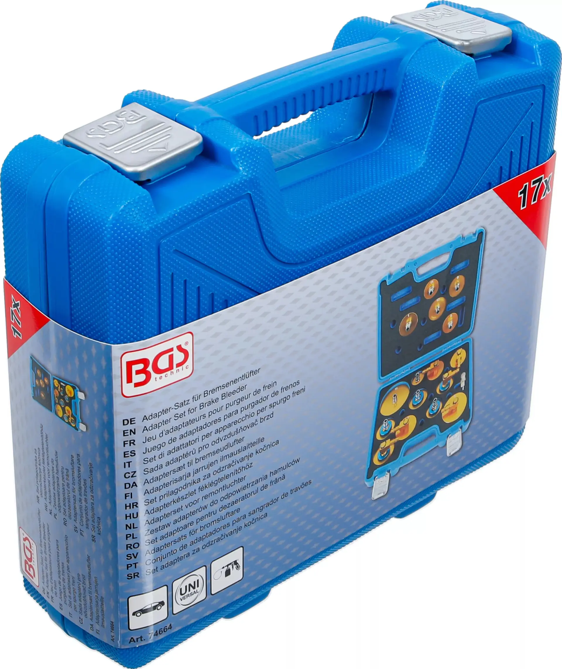 Sada adaptérů pro odvzdušňovač brzd obsahuje 17 různých kusů, které umožňují kompatibilitu s většinou běžných brzdových systémů osobních i užitkových vozidel. Praktické plastové pouzdro usnadňuje přenášení i organizaci jednotlivých adaptérů.