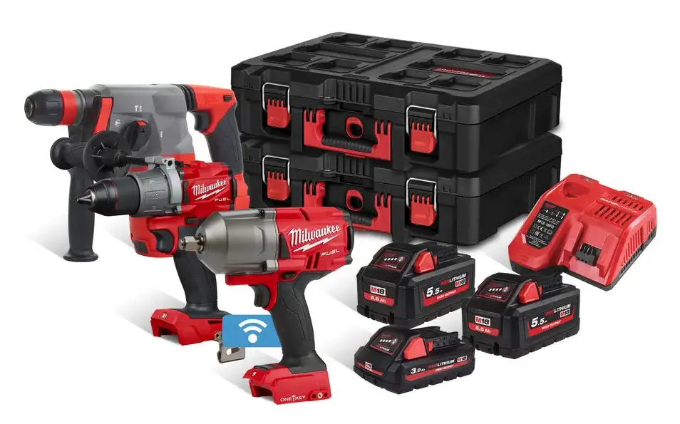 Sada aku nářadí Milwaukee M18 FPP3Q2-533P obsahuje tři nástroje, dva akumulátory 5,0 Ah, rychlonabíječku a kufr pro snadné přenášení i skladování. Vše je kompatibilní s platformou M18, což umožňuje využití stejné baterie pro více zařízení.