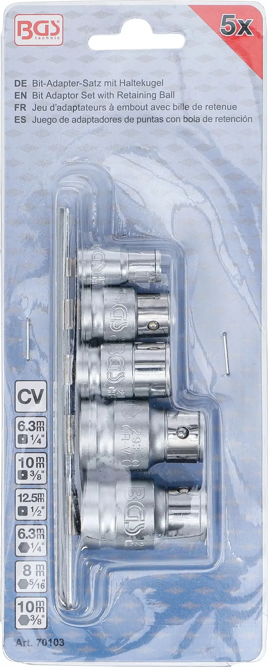 Sada bitových adaptérů obsahuje pět dílů s rozměry 6,3 mm, 10 mm a 12,5 mm, které umožňují snadné propojení různých nástavců a ráčen. Adaptéry jsou vybaveny pojistnou koulí pro pevné uchycení.