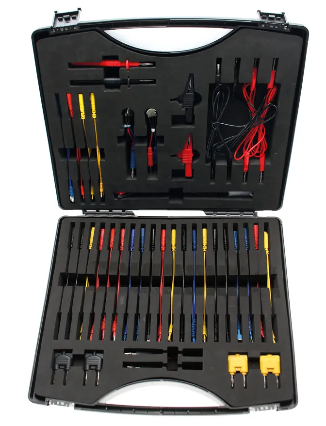 Součástí balení jsou různé typy měřicích kabelů, zkušebních hrotů, krokosvorek, pinzet a adaptérů. Díky této rozmanitosti lze snadno přizpůsobit měření konkrétním potřebám a situacím, ať už jde o testování napětí, odporu nebo průchodnosti obvodů.