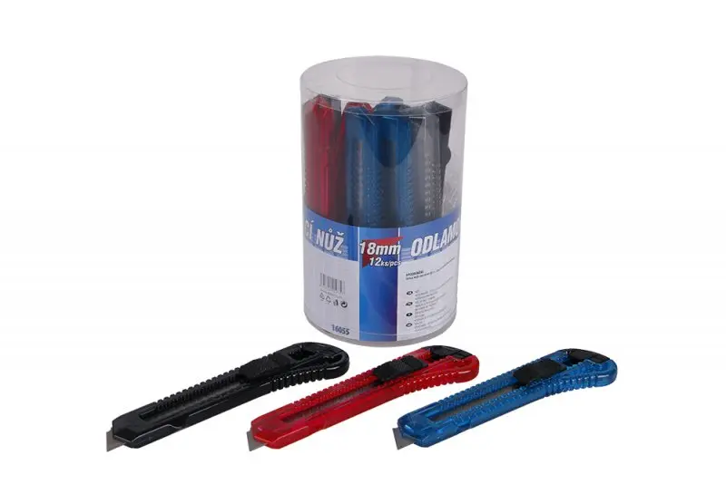 Sada nožů 12 ks doza 18mm (L16055) nabízí praktické řešení pro každého, kdo potřebuje spolehlivý nástroj na řezání různých materiálů. Každý nůž v sadě je vybaven segmentovanou čepelí o šířce 18 mm, což umožňuje snadné odlamování tupých částí a udržení ostrého břitu po delší dobu.