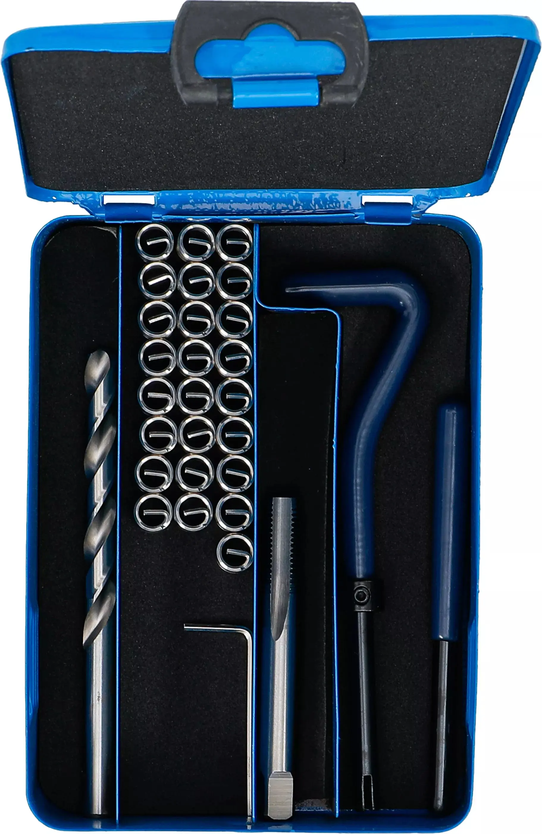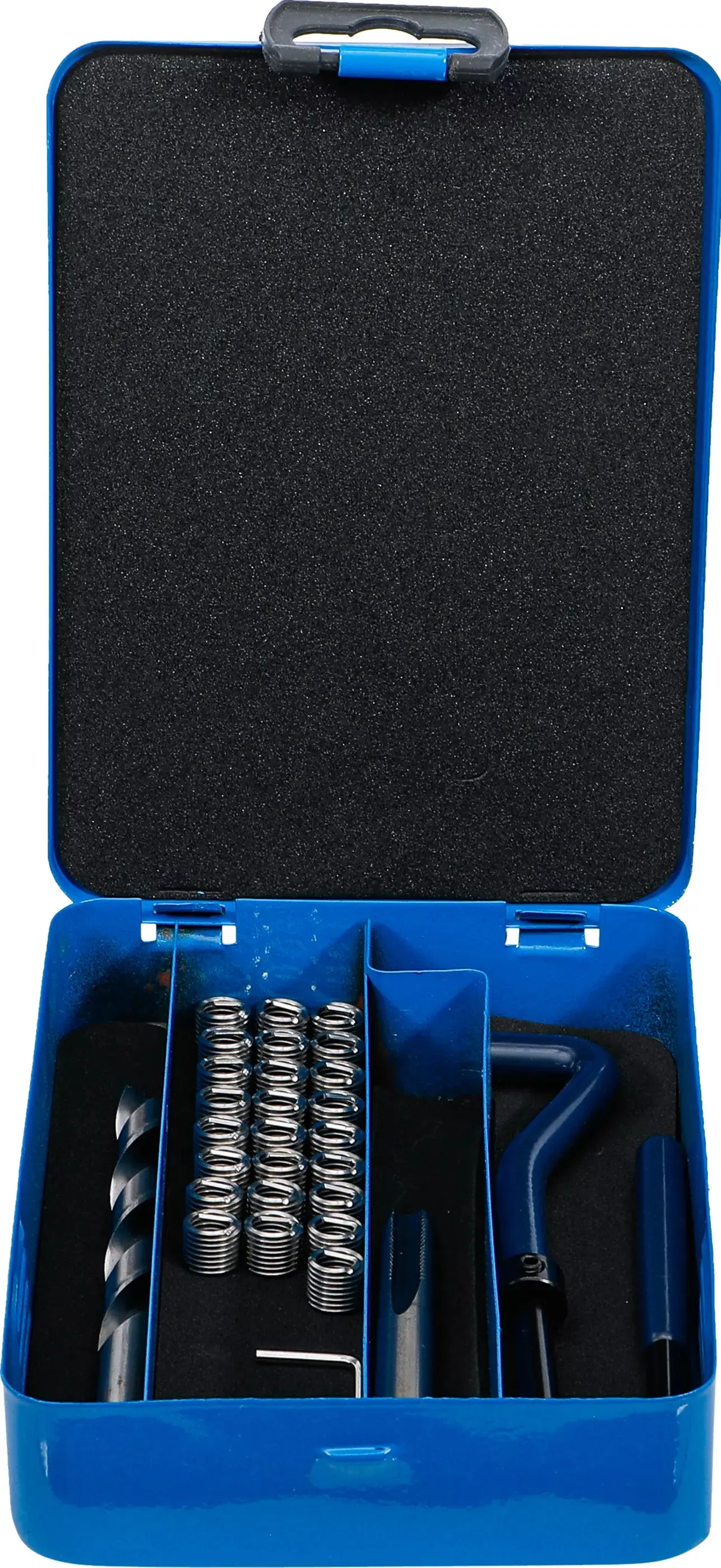 Sada pro opravu závitů M8 x 1,25 mm obsahuje 29 dílů včetně závitníků, vložek a montážního příslušenství pro rychlou a přesnou renovaci poškozených závitů. Vše je přehledně uloženo v praktickém kufříku.