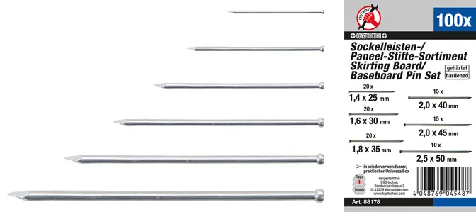 Tato sada obsahuje 100 kusů soklových lišt a panelových kolíků, které jsou určeny pro různé montážní a instalační práce v interiéru. Díky univerzálním rozměrům je možné je využít při upevňování soklových lišt, panelů nebo dalších stavebních prvků, kde je potřeba pevné a spolehlivé spojení.