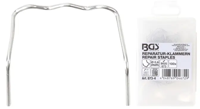 Balení obsahuje 100 kusů sponek, což poskytuje dostatečnou zásobu pro více oprav nebo pro práci v dílně, kde je potřeba mít náhradní materiál vždy po ruce. Sponky jsou kompatibilní s většinou běžných svářeček plastů, které pracují s opravnými sponkami tohoto typu a rozměru.