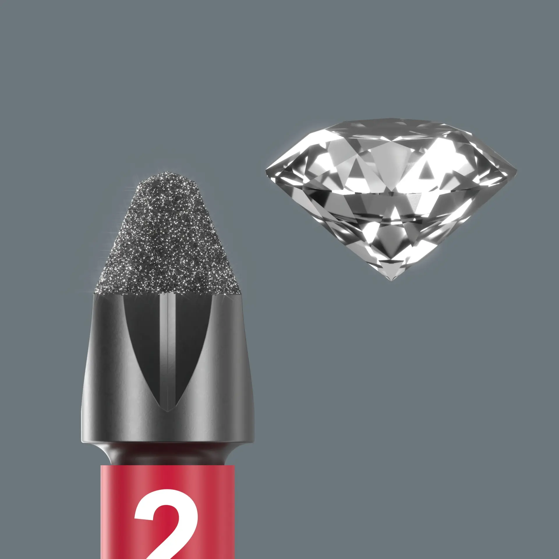 Drsná diamantová povrchová vrstva bitů díky zvýšenému odporu třením snižuje riziko vyklouznutí ze šroubu.
