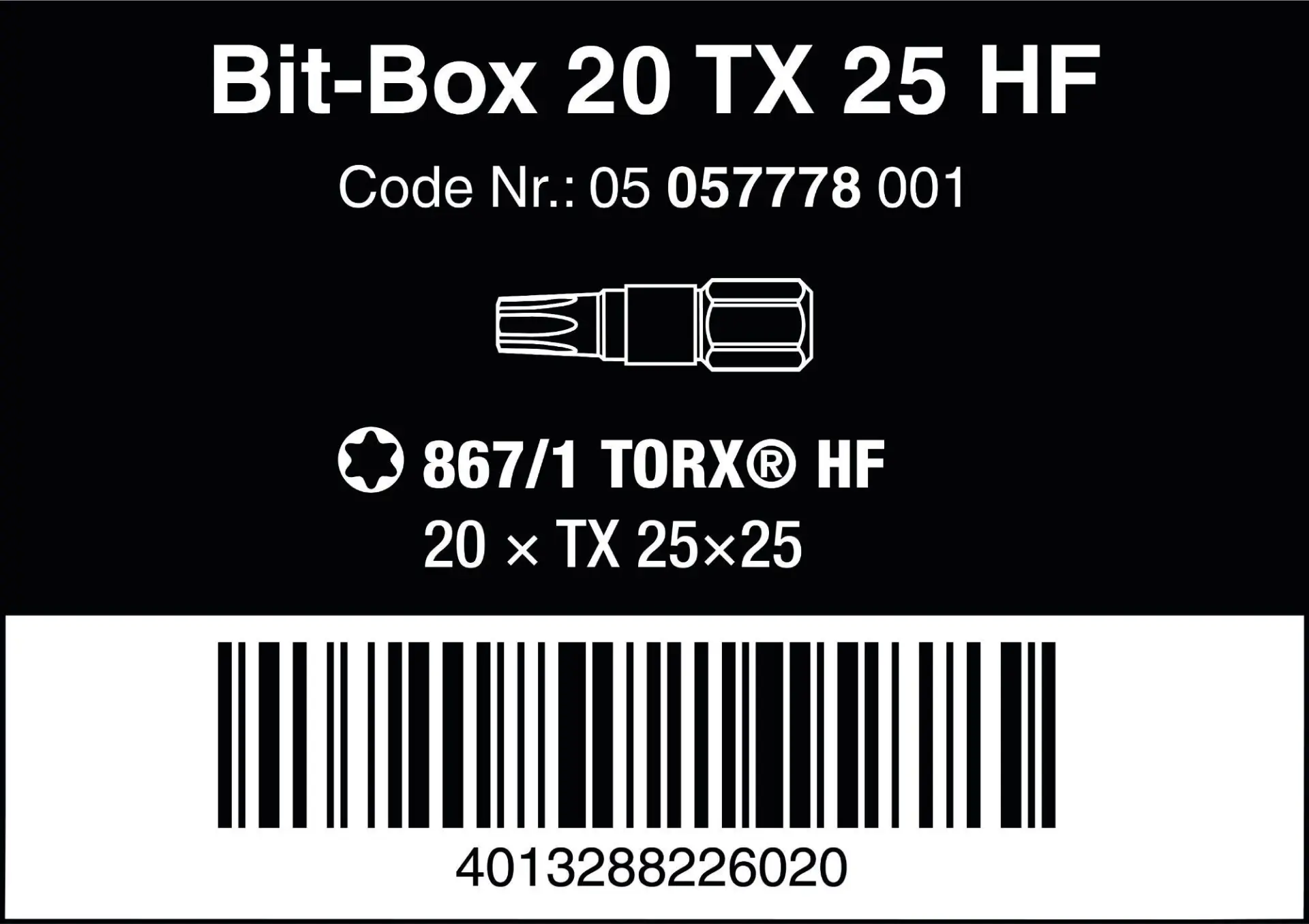 Sada dvaceti šroubovacích bitů Wera 1/4" Bit-Box 25 TX HF obsahuje bity s funkcí držení šroubu, vhodné pro Torx šrouby a precizní práci. Praktické balení usnadňuje přenášení i organizaci.