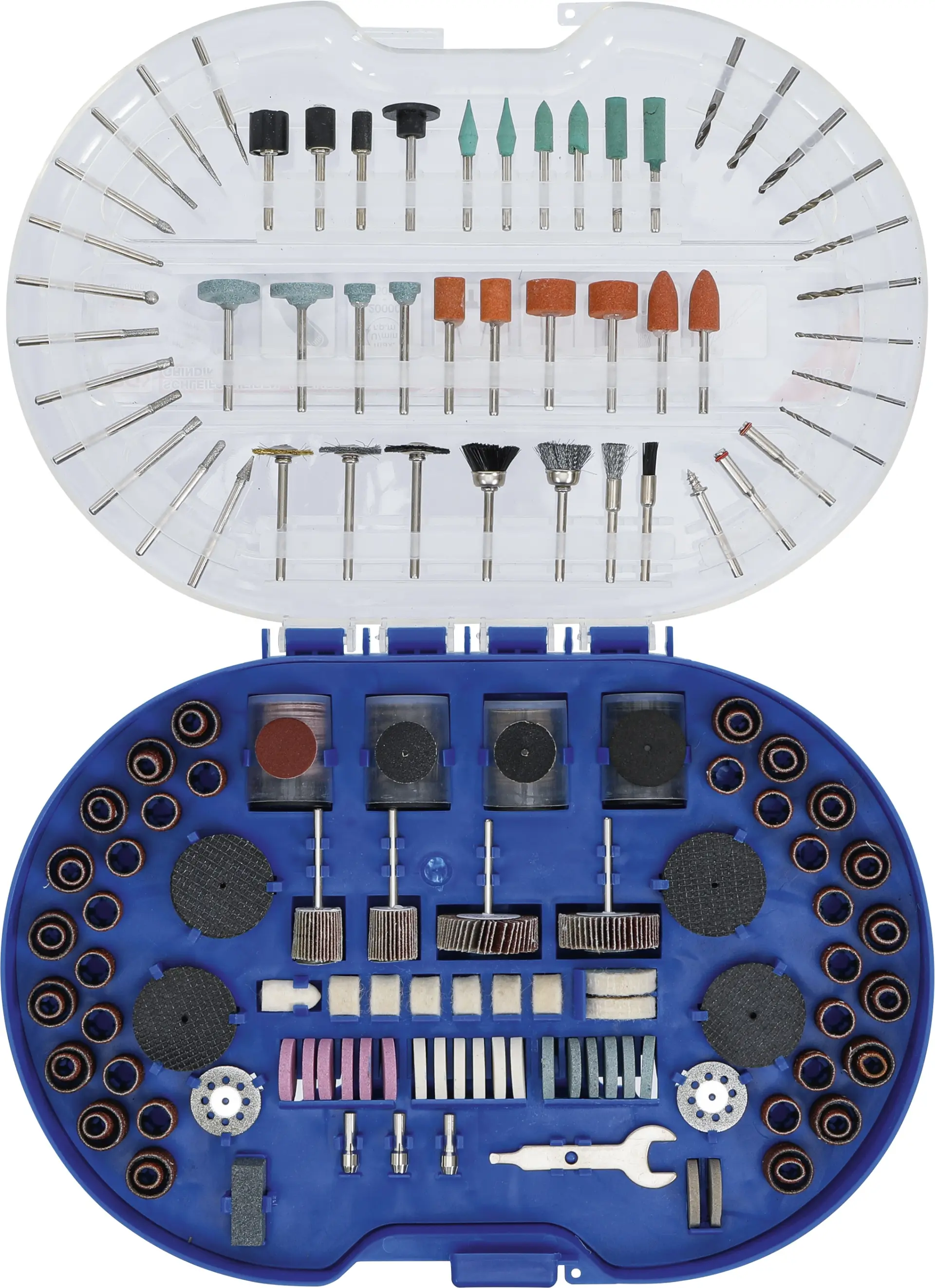Sada obsahuje 315 dílů pro broušení, leštění a vrtání, kompatibilních s nářadím s vysokými otáčkami, vhodná pro různé materiály a detailní práci. Vše je přehledně uloženo v praktickém boxu.