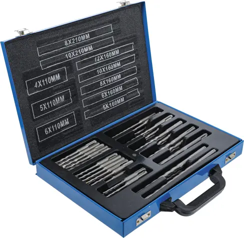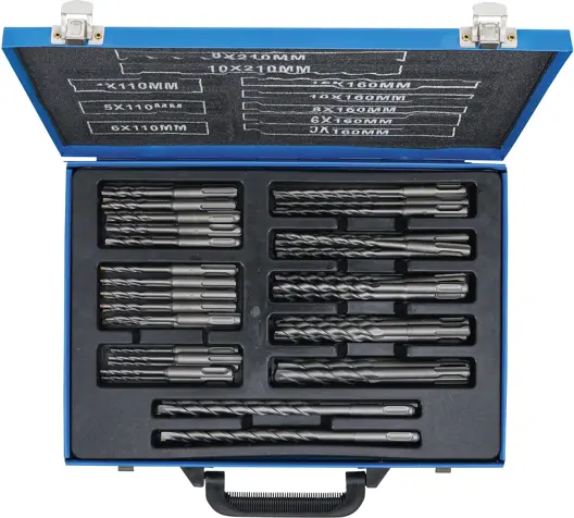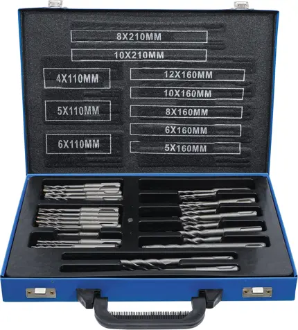 Sada 56 vrtáků SDS-Plus s průměry 4–12 mm v praktické kazetě pokrývá široké spektrum vrtacích prací do betonu, zdiva i kamene. Robustní provedení zajišťuje dlouhou životnost a přesné výsledky.