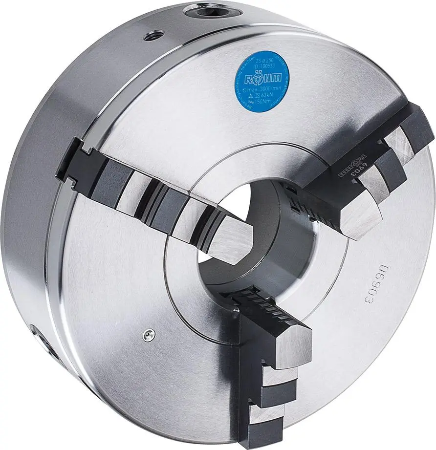 Tělo sklíčidla je vyrobeno z oceli podle normy DIN6350, což zajišťuje dlouhou životnost a odolnost vůči opotřebení. Tři čelisti se pohybují synchronně, takže upnutí je rovnoměrné a stabilní, což je důležité pro přesnost obrábění.