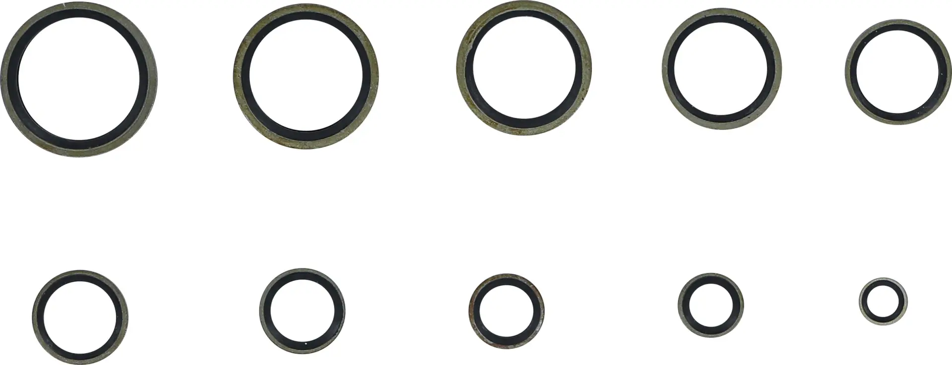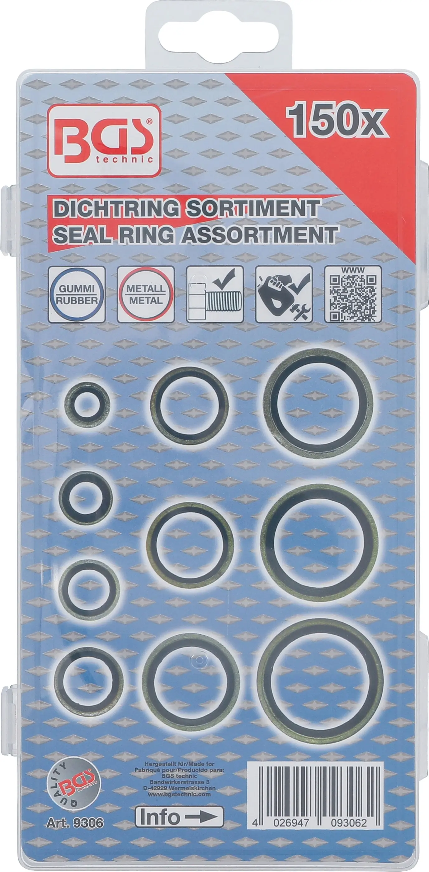 Sada 150 kovových těsnicích kroužků s gumovou manžetou BGS109306 nabízí různé rozměry pro spolehlivé utěsnění spojů v automobilovém i průmyslovém prostředí. Vhodné pro opravy a údržbu.
