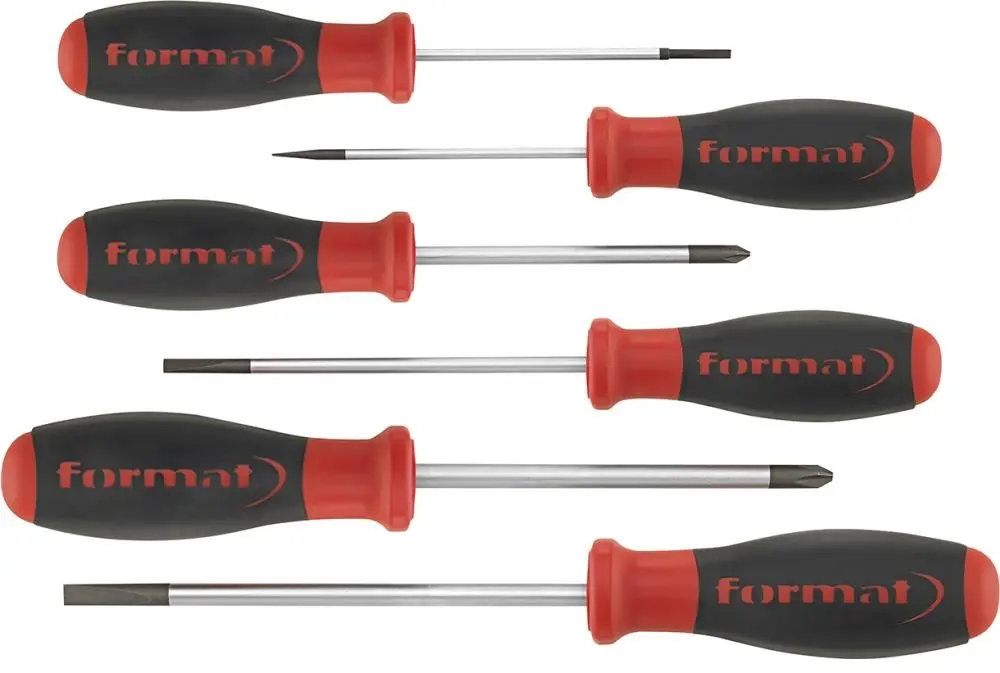 Sada šroubováků FORMAT obsahuje 6 kusů plochých a křížových (PH) nástrojů. Ergonomické rukojeti usnadňují manipulaci při práci v dílně i domácnosti.