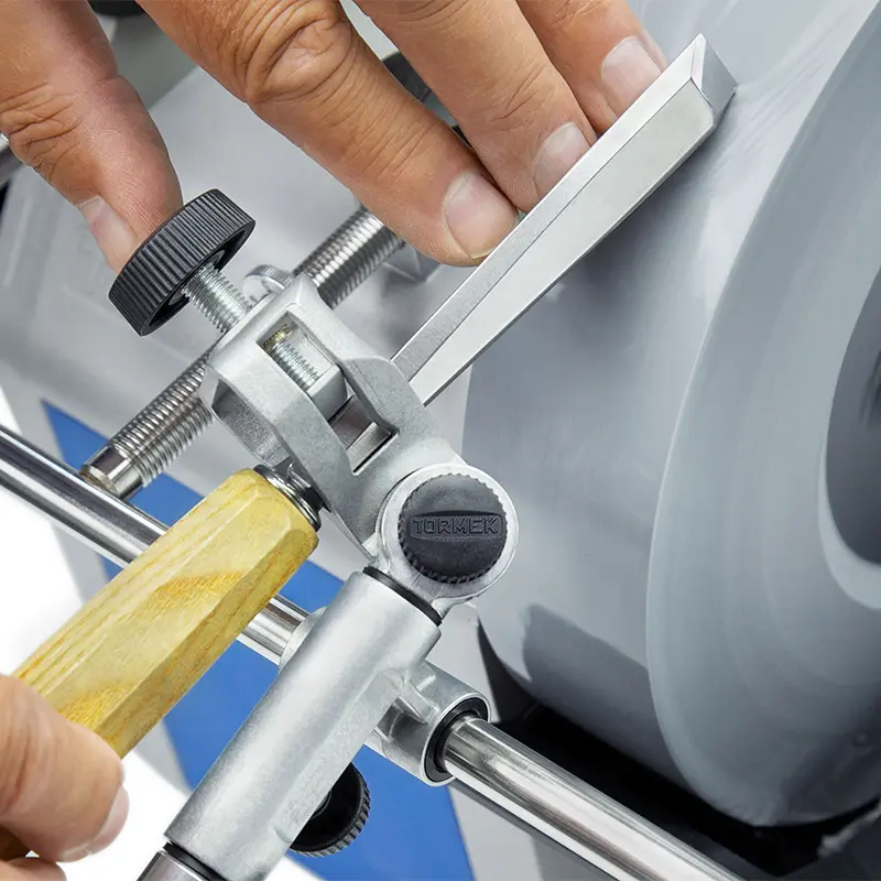 • Uzamykací knoflík také umožňuje ostření zcela plochým zkosením na houslařských nožích při použití kotoučů Tormek MB-100 Multi Base a diamantových brusných kotoučů
