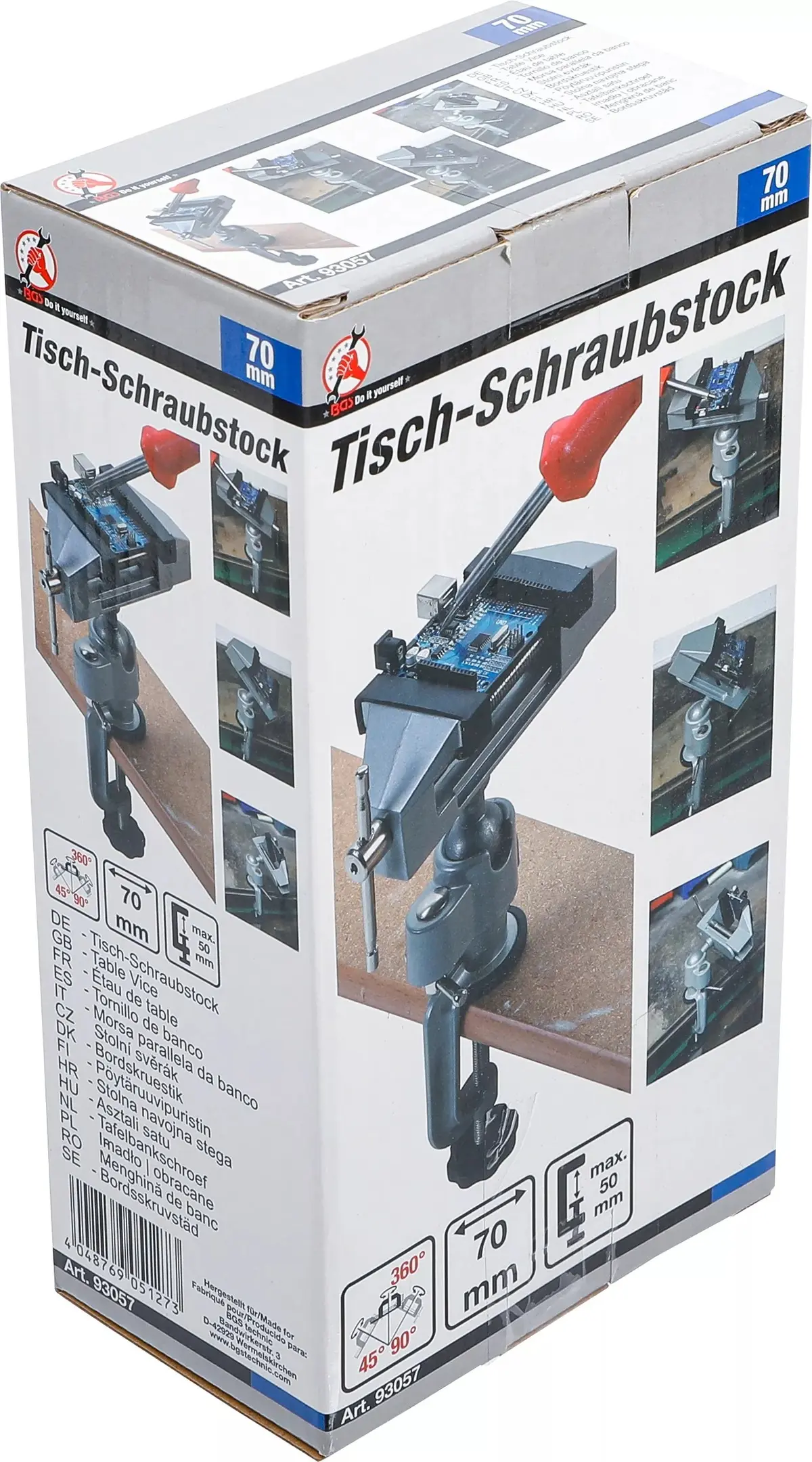 Stolní svěrák s otočnou základnou a čelistmi o šířce 70 mm je určen pro pevné uchycení materiálu při práci v dílně, garáži nebo na pracovním stole. Otočná základna umožňuje nastavit svěrák do požadované polohy, což usnadňuje přístup k obrobku z různých úhlů.