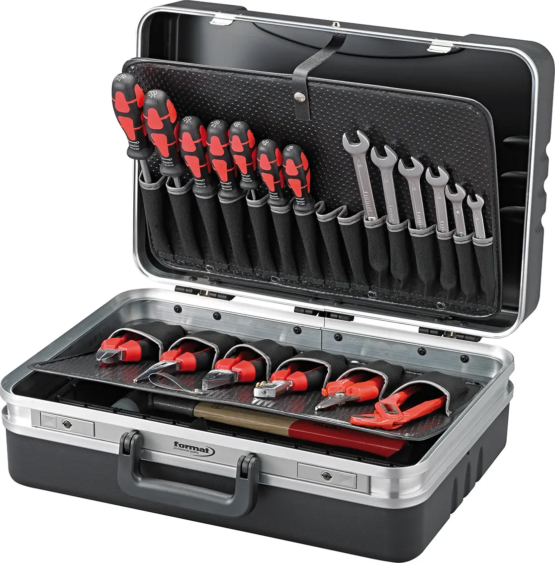 Provedení: Z plastu ABS odolného proti opotřebení, rezistentního proti vlhkosti, černého, s pevnými deskami na nářadí ze speciálního plastu pro odolnost proti škrábání, tvarovou stabilitu, a odolnost proti vlhkosti, tukům a chemikáliím a se stabilní rukojetí. Skořepina dna s výškou 58 mm, volně rozdělitelná. S pozinkovanými kovovými kloubovými závěsy, kufr zatížitelný do 20 kg, obvodový rám z hliníku. Velmi stabilní, s kluznými lištami. Zamykatelný 2 klopnými zámky. Dodává se bez obsahu.