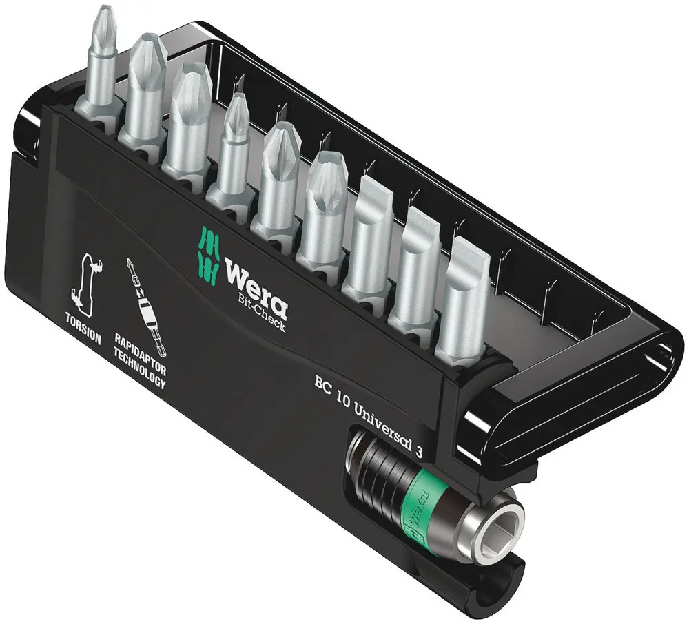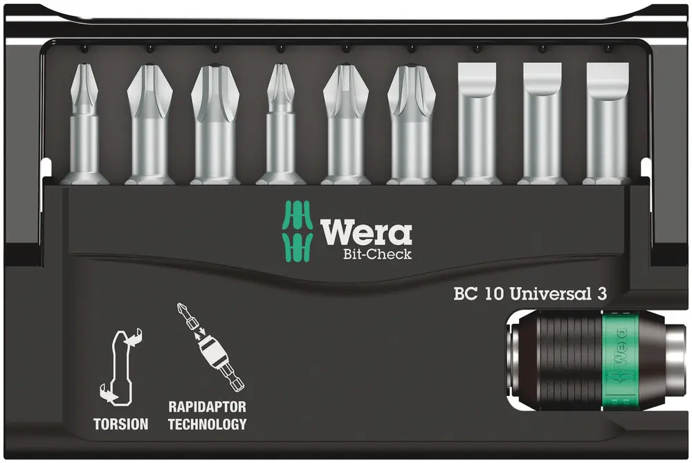 Sada obsahuje univerzální držák Rapidaptor se silným permanentním magnetem a rychloupínacím sklíčidlem pro upínání bitů s připojovacím rozměrem vnějšího šestihranu 1/4“ podle DIN ISO 1173-C 6,3 a E 6,3 (včetně bitů Wera řady 1 a 4)