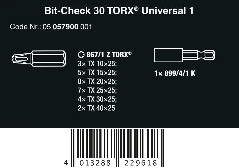 Sada Wera Bit-Check 30 TX Universal obsahuje 30 šroubovacích bitů 1/4" s profilem Torx, které jsou uloženy v kompaktním a přehledném pouzdře. Bity jsou vhodné pro univerzální použití v ručních i elektrických šroubovácích.
