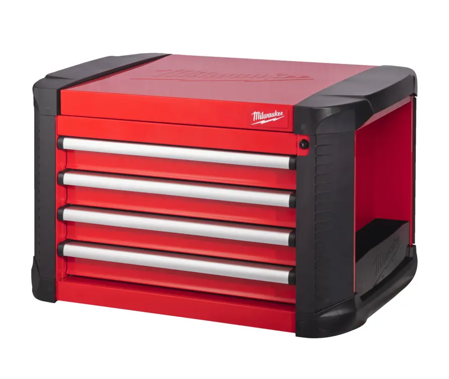 Policová ocelová nářaďová bedna Milwaukee s 4 zásuvkami. Prázdná