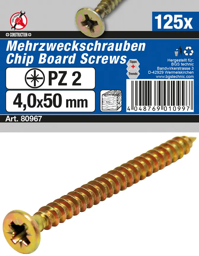 Víceúčelové šrouby s křížovou drážkou PZ2 o rozměrech 4,0 x 50 mm jsou určeny pro široké spektrum montážních prací v domácnosti i dílně. Díky univerzálnímu provedení je lze použít při spojování dřeva, dřevotřísky, plastů nebo tenkých kovových materiálů.