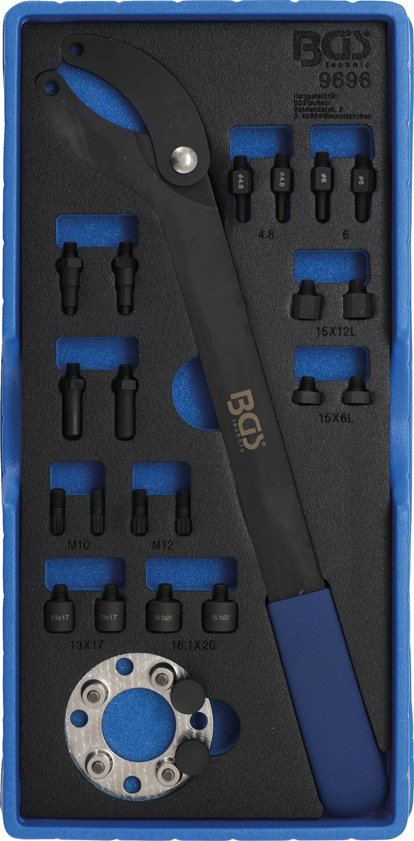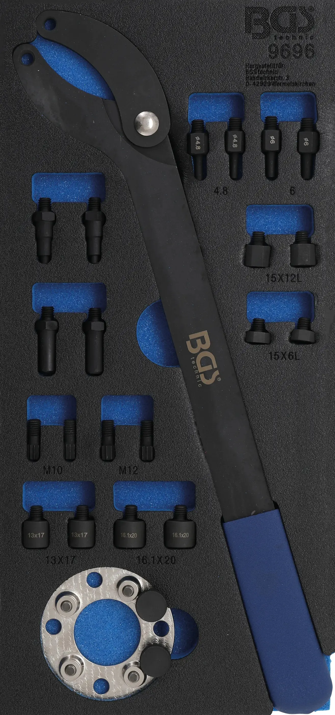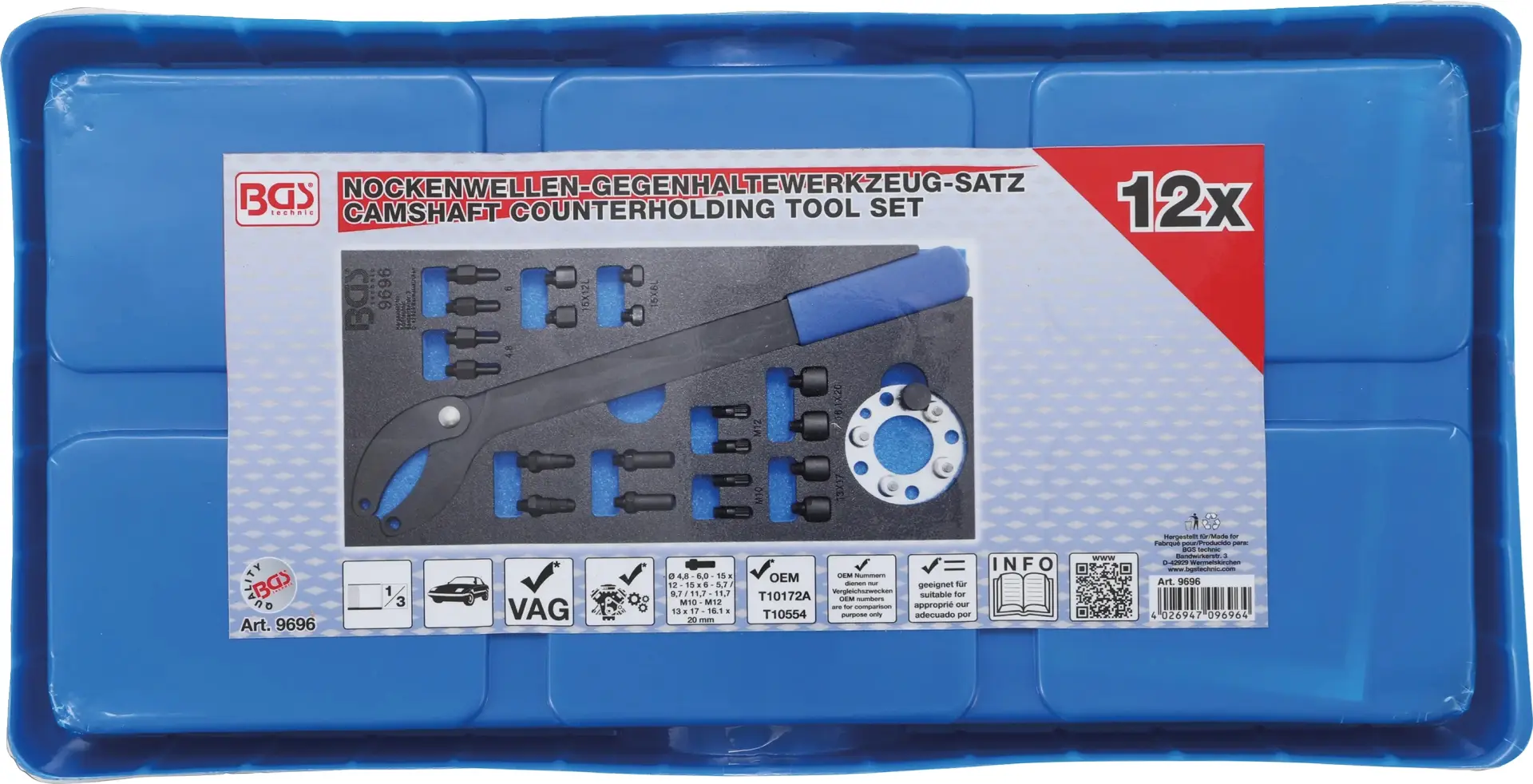 Souprava nářadí BGS 9696 je určena k přidržování vačkových hřídelí u vozidel VAG a je vhodná pro vložení do dílenského vozíku 1/3. Přesné zpracování usnadňuje práci při opravách motorů a zajišťuje kompatibilitu s vybranými modely.