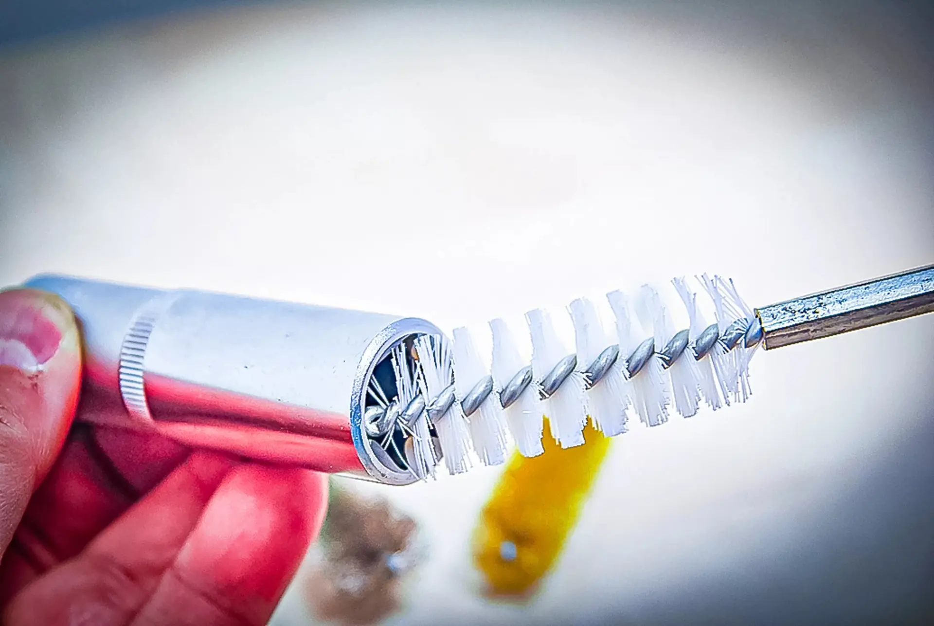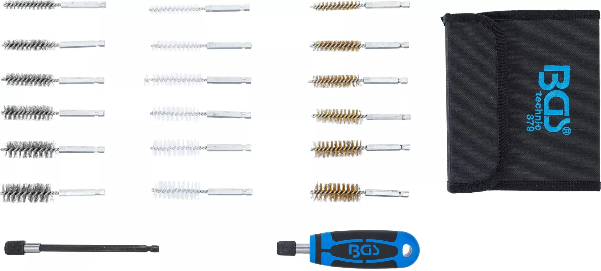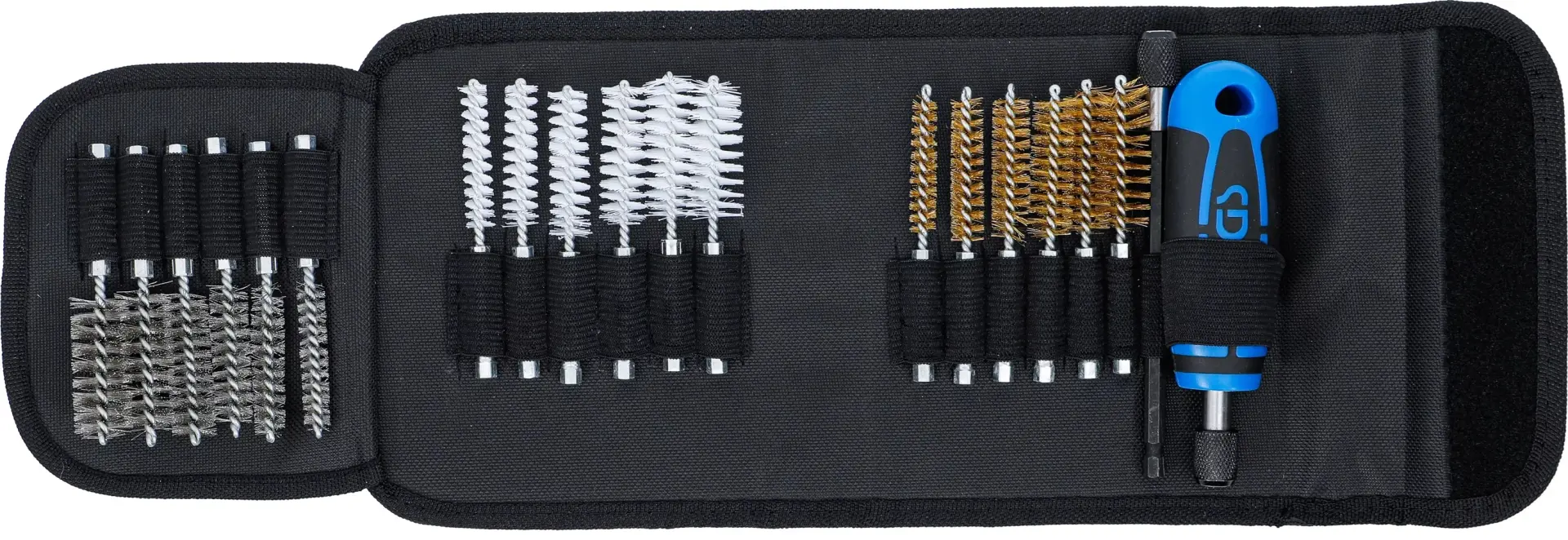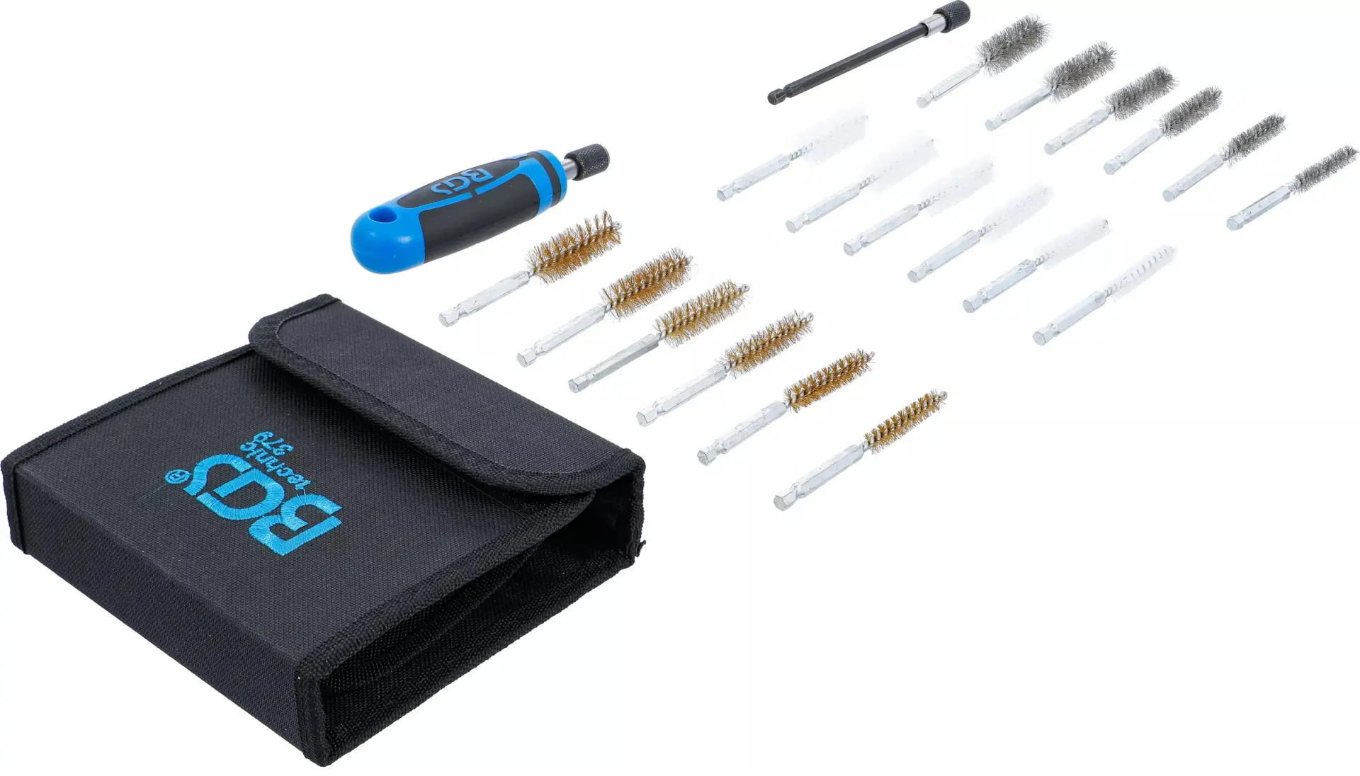 Sada vnitřních kartáčů BGS100379 obsahuje 20 dílů s výměnnou rukojetí a praktickým pouzdrem, vhodných pro čištění těžko přístupných míst v dílně i domácnosti.