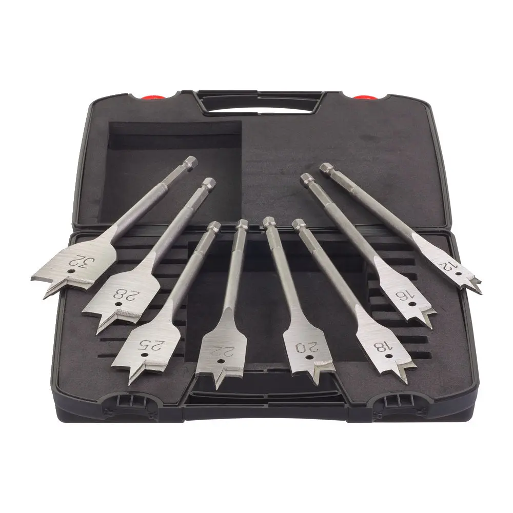 Tato sada plochých vrtáků obsahuje osm kusů s průměry 12, 16, 18, 20, 22, 25, 28 a 32 mm, což umožňuje široké využití při práci se dřevem. Každý vrták má délku 152 mm, což poskytuje dostatečný dosah pro běžné i náročnější úkoly v dílně nebo na stavbě.