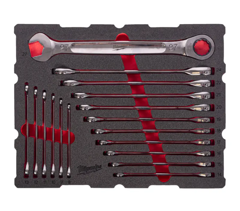 Vybavená pěnová vložka Milwaukee do PACKOUT boxu, očkoploché ráčnové klíče, 17 ks nářadí, 4932501872